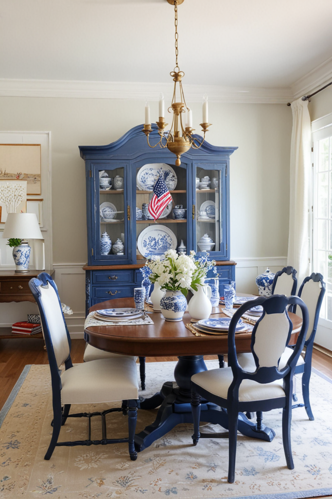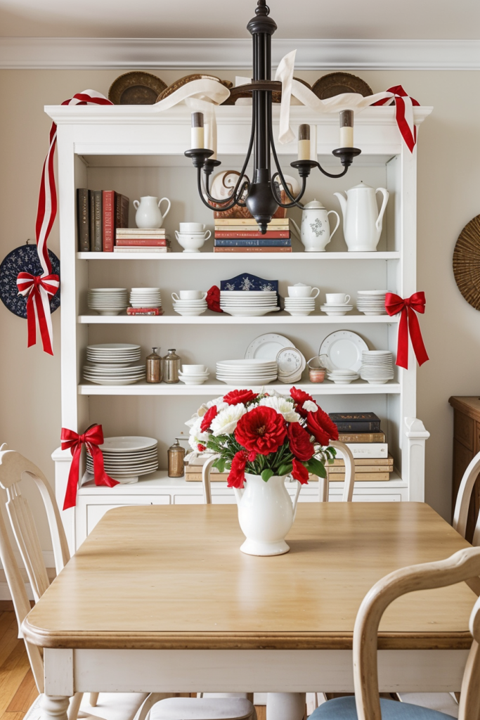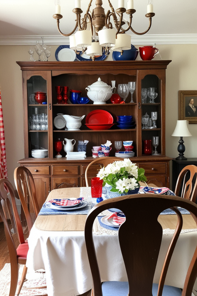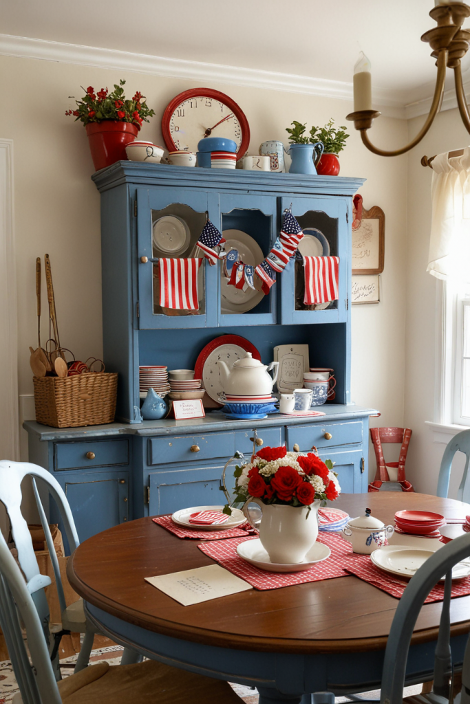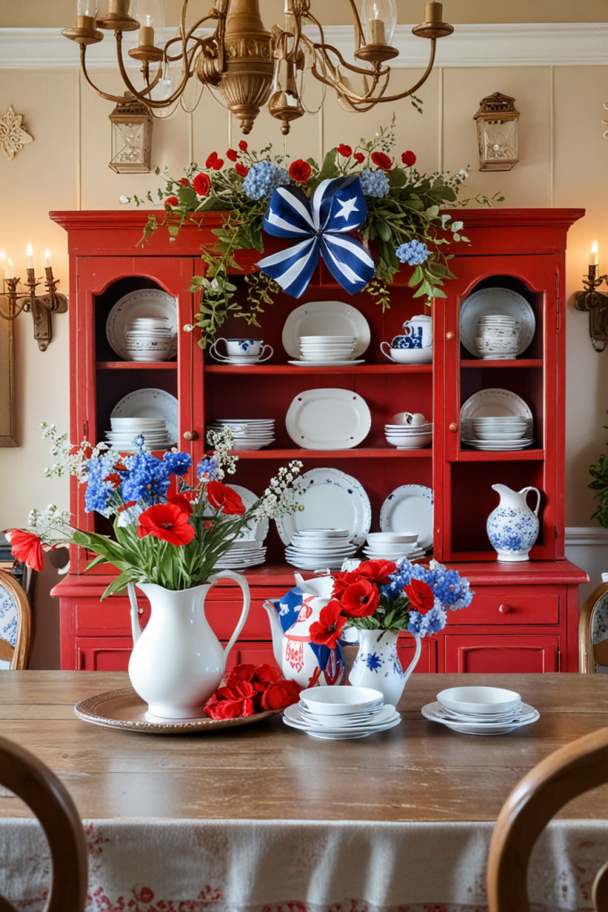 This kind of 4th of July hutch decor is a bit more simple and embodies elegance. Using blue and white gives the decor a sophisticated flair. Place white milk glass, blue chinoiserie vases, and blue linen napkins on the shelves. The color scheme dutifully acknowledges the flag while providing an everlasting calm appeal.