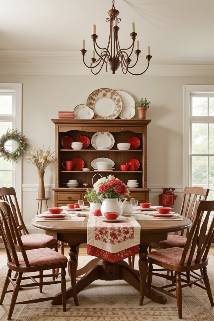 In patriotic vintage styles, red transferware is a must. Combine the plates and stack them, put small bowls on top, and include the platters as a centerpiece. It looks stunning when used with ironstone pitchers or creamware. This type of hutch styling is visually appealing. It perfectly brings back memories of early Americans’ homes while keeping modern trends in mind.