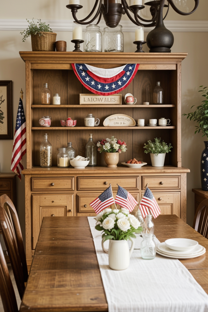 Farmhouse antiques make it easier to accentuate rustic charm without losing the elevated tone of your hutch setup. Vintage American pieces such as glass milk bottles, wooden tools, and enamelware fit perfectly. Utilizing these alongside clean-structured furniture and vintage patriotically colored linens presents a grounded and tasteful tribute to traditional farmhouse antiques while adding an elegant touch.