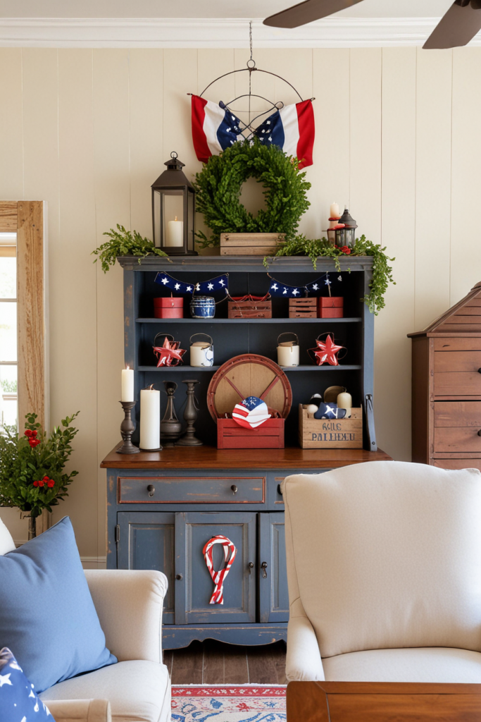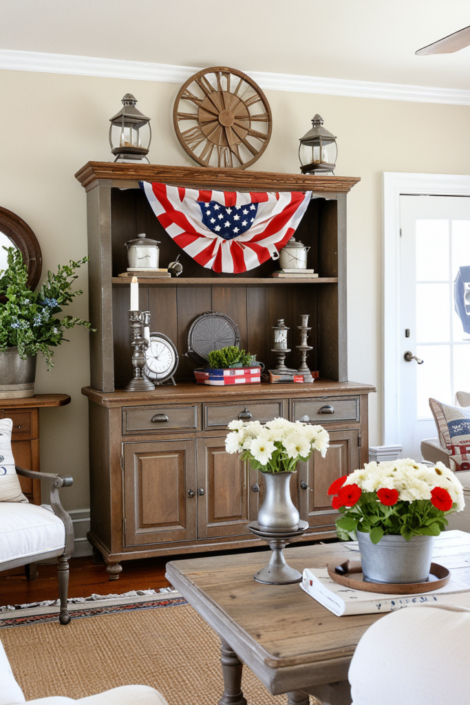 4th of July Hutch Decor in the Vintage-Inspired Living Room