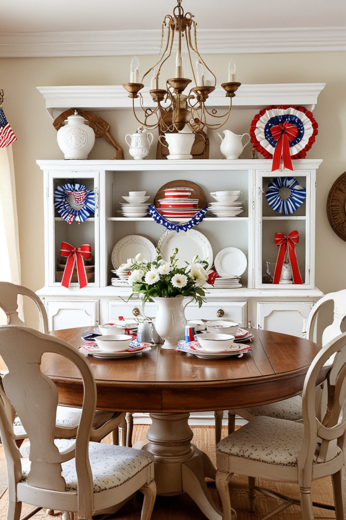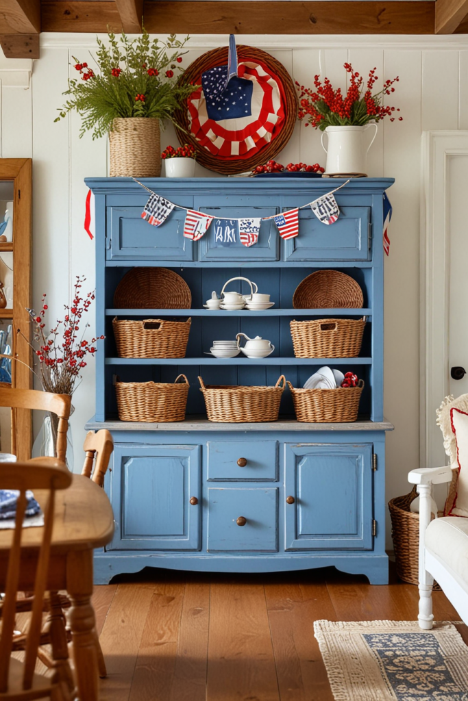 This kind of 4th of July hutch decor is a bit more simple and embodies elegance. Using blue and white gives the decor a sophisticated flair. Place white milk glass, blue chinoiserie vases, and blue linen napkins on the shelves. The color scheme dutifully acknowledges the flag while providing an everlasting calm appeal.