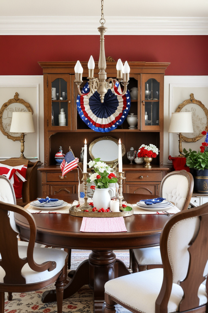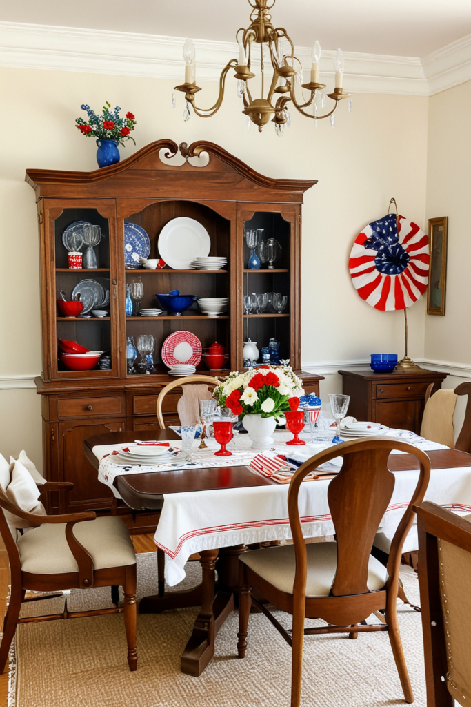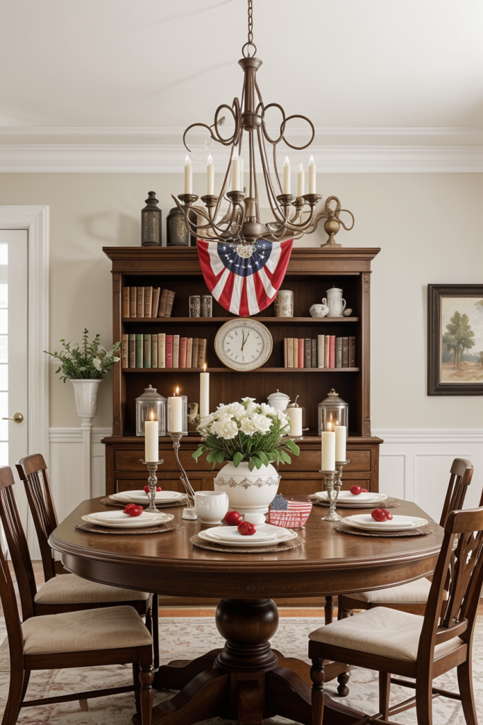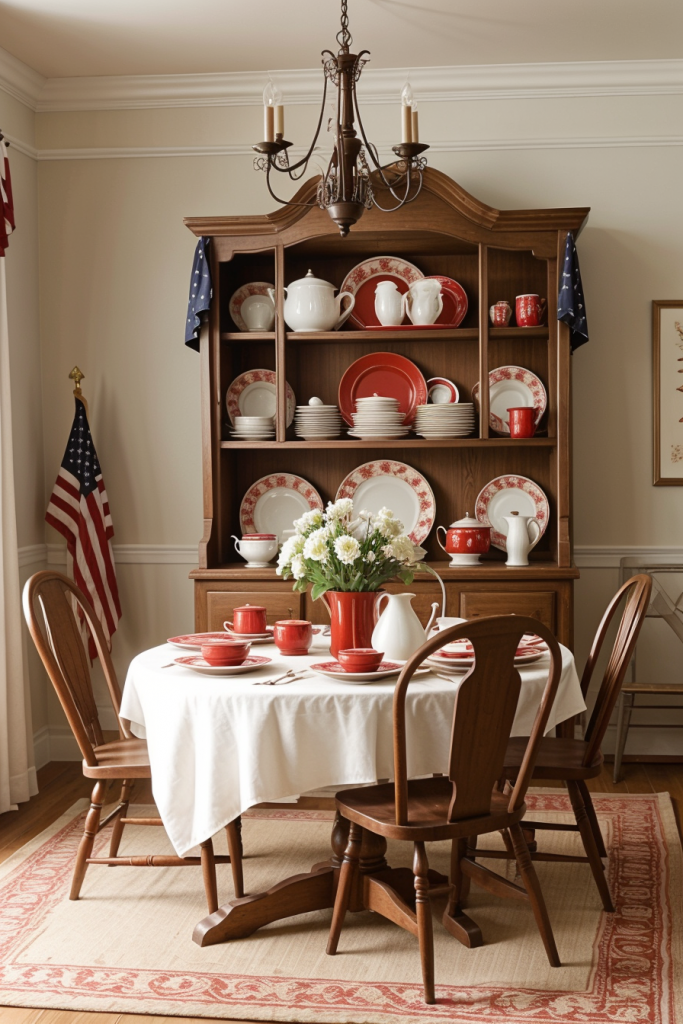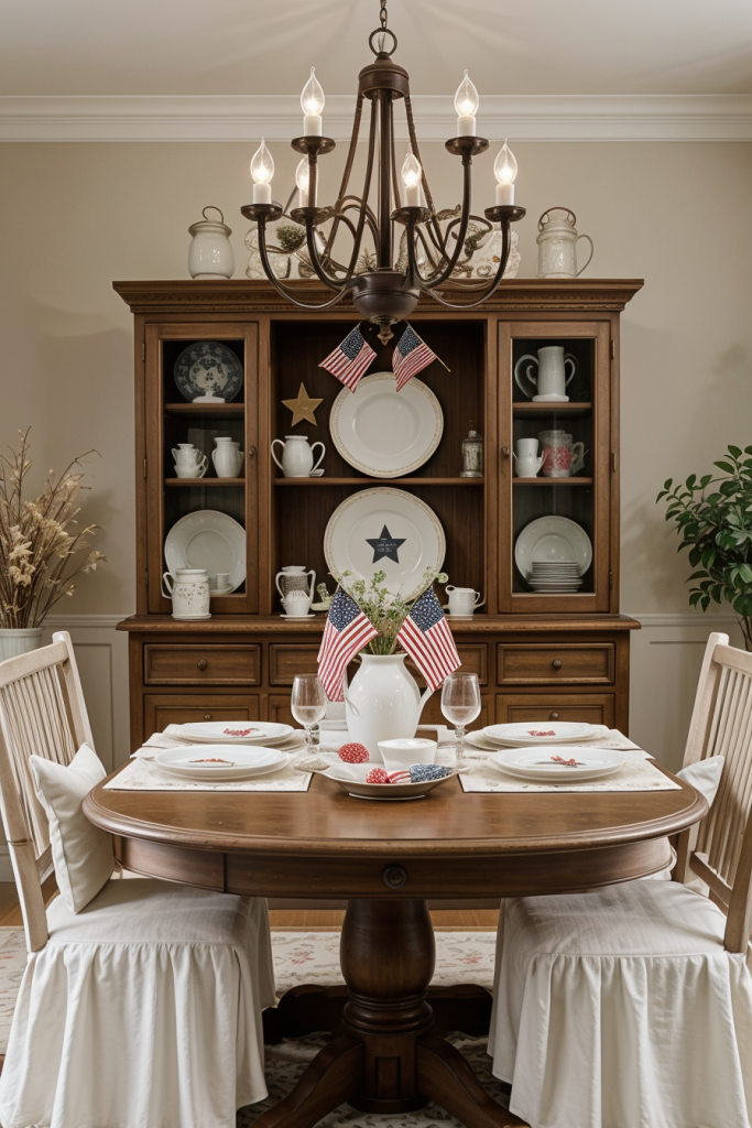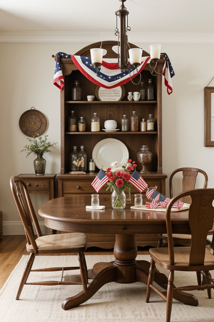 If you are someone who appreciates transitional interiors, incorporating modern grandeur with a vintage 4th of July decor gives a styled, designer interior. Incorporating a simple hutch in neutral shades will work well combined with vintage bunting including aged tins and subtle textures like navy, crimson, and cream. Use contemporary lighting or a streamlined hugging dining table to avoid clutter in the room.