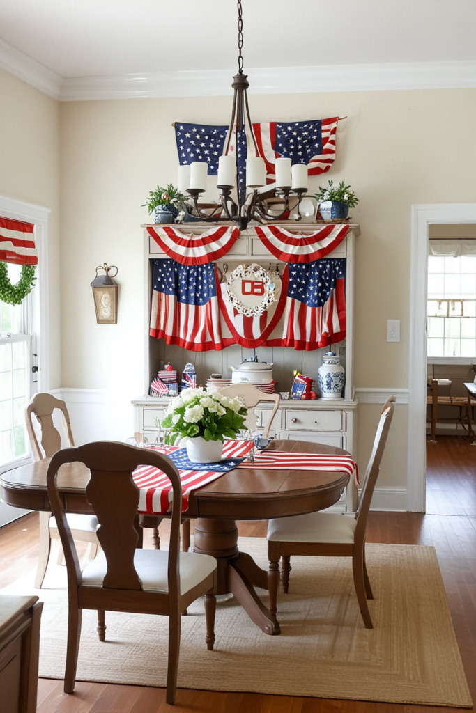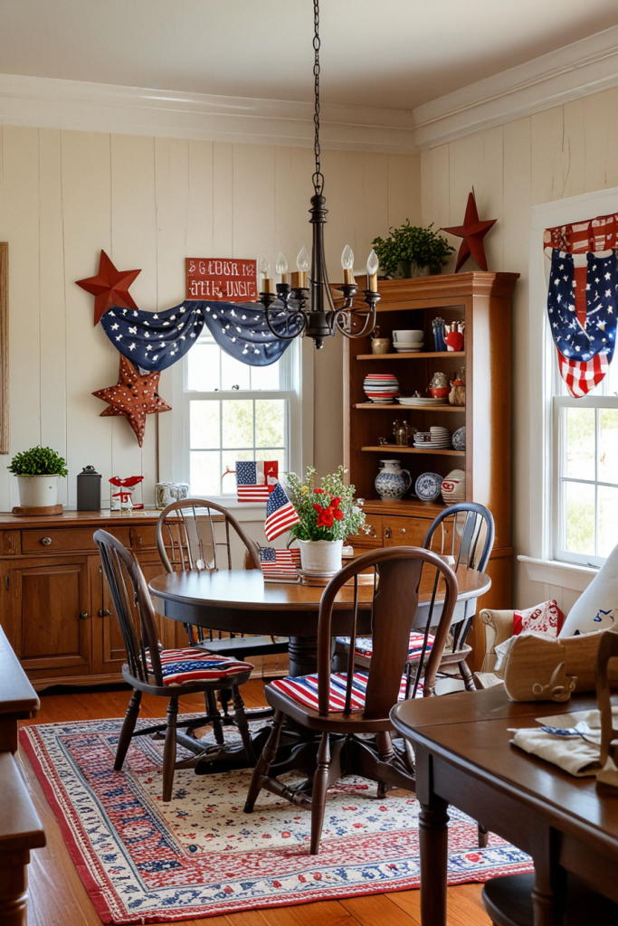 Not every flag-themed décor has to be over the top. Subtle stars and stripes can bust be stylish and artistic. You can incorporate tapestry napkins, carved wooden stars, or hand-painted dishes beside antique jugs and bowls. The gentle and subtle incorporation of these motifs deepens the vintage charm. This design works exceptionally well in rooms that have muted colors and soft, refined aesthetics.