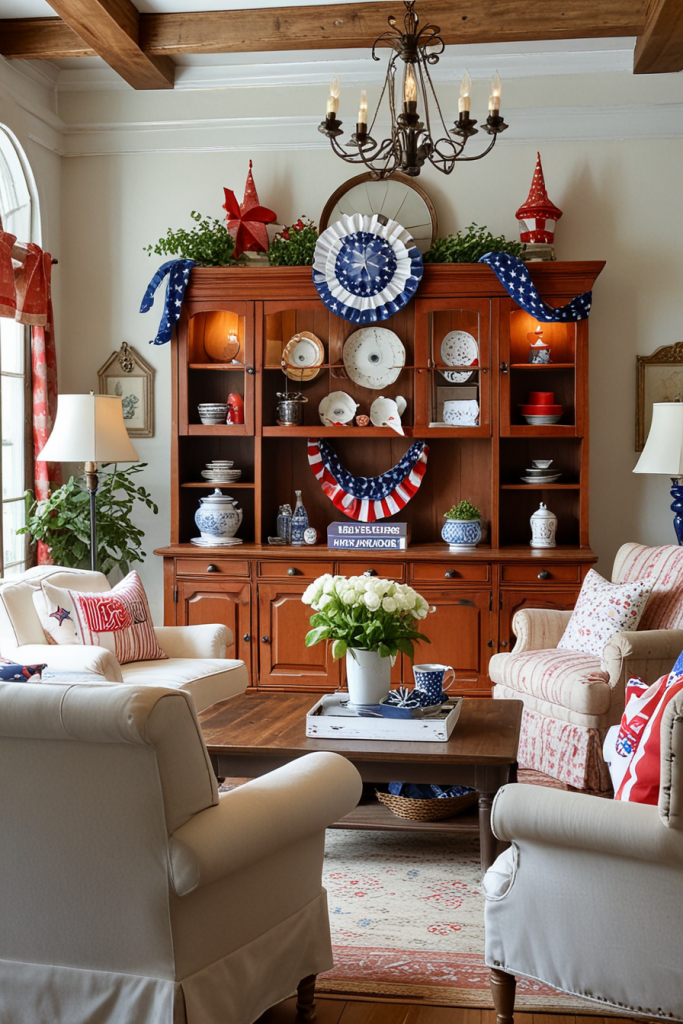 Transforming a living room for the 4th of July in a vintage style requires precision as one combines sophistication with patriotism. One adds history to the space by styling the hutch with aged wood finishes, faded flags, and vintage Americana collectibles. Complete this look with red, white, and blue touches like fabric book covers and crafted décor pieces. Everything remains elegant yet comfortable, and the 4th of July hutch decor stores effortlessly into a heritage rich home.