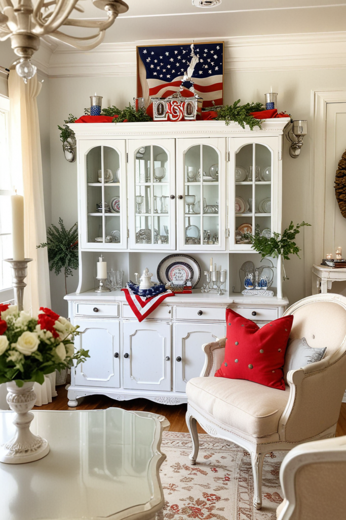 A classic china hutch sustains an ideal backdrop for celebrating patriotism with grace. To maintain elegance, choose a neutral background and adorn it with miniature American flags, star porcelain, and red and blue antique dishware. Remember—balance is crucial, and you will want to avoid overcrowding the shelves. The collection exudes a blended old-world elegance with decor that feels both elevated and heartfelt.