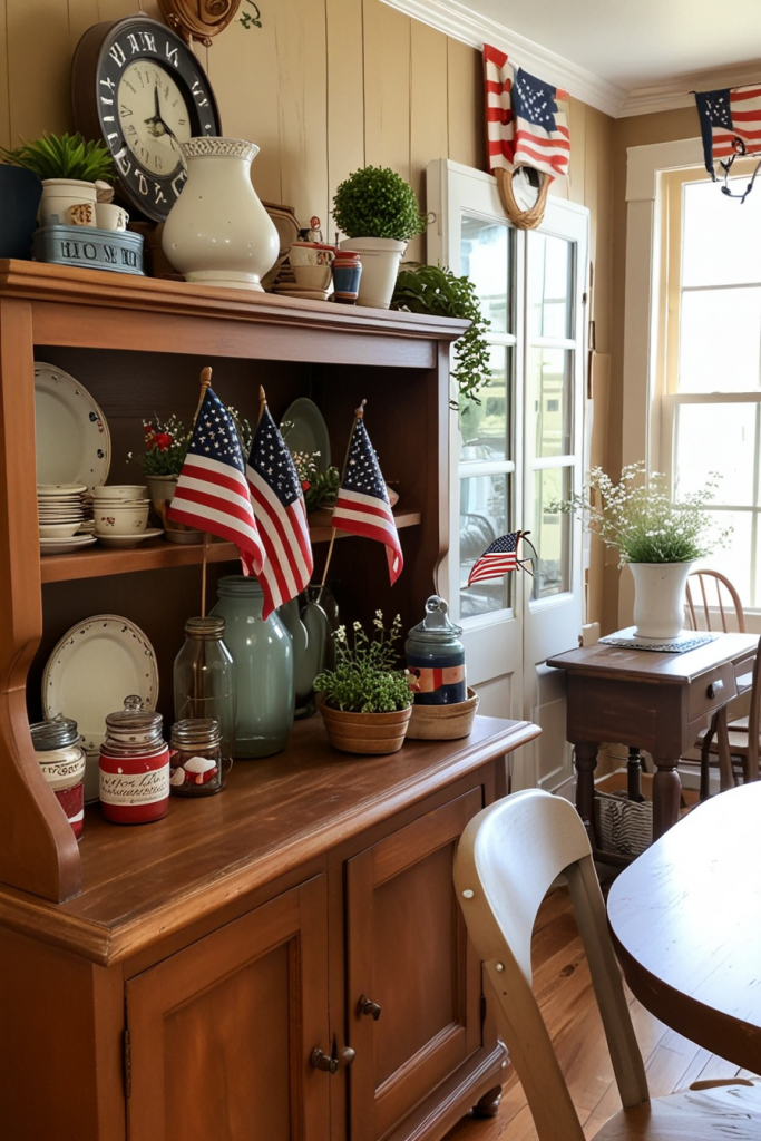 Farmhouse antiques make it easier to accentuate rustic charm without losing the elevated tone of your hutch setup. Vintage American pieces such as glass milk bottles, wooden tools, and enamelware fit perfectly. Utilizing these alongside clean-structured furniture and vintage patriotically colored linens presents a grounded and tasteful tribute to traditional farmhouse antiques while adding an elegant touch.