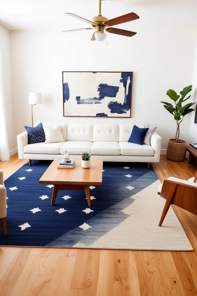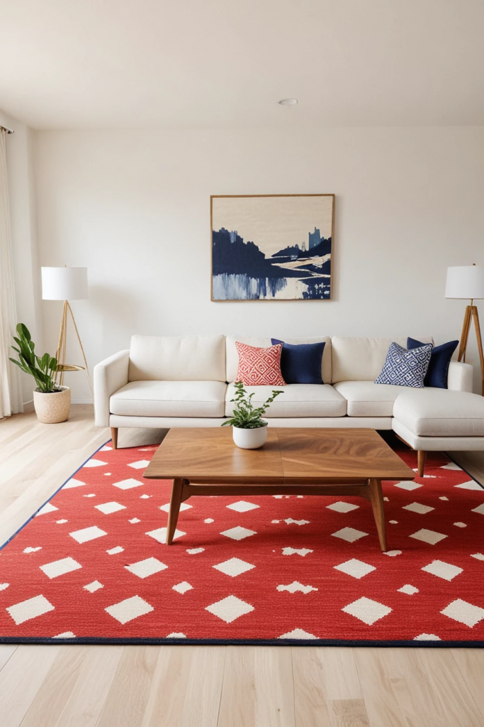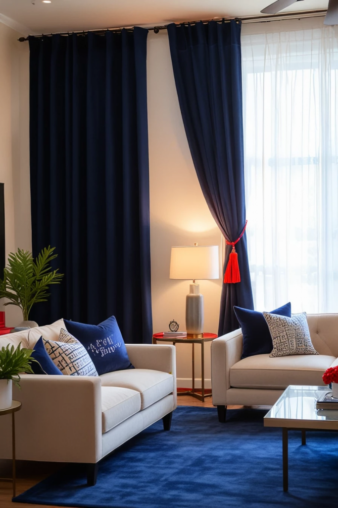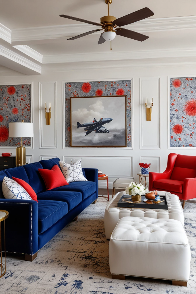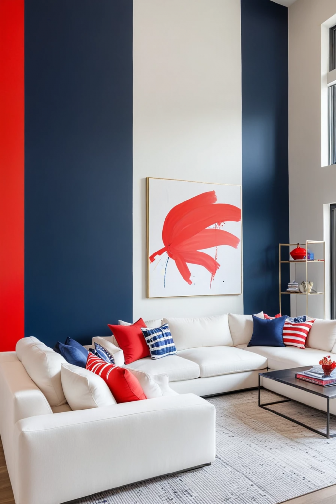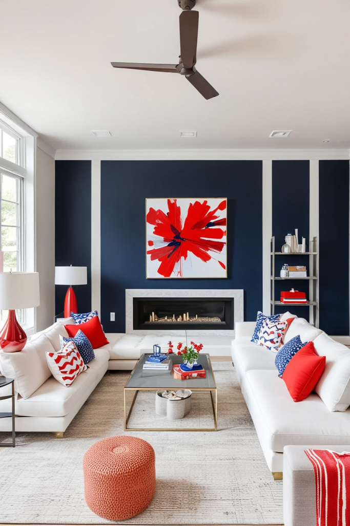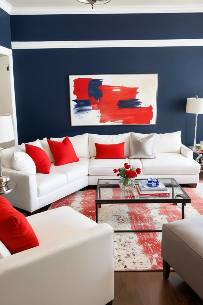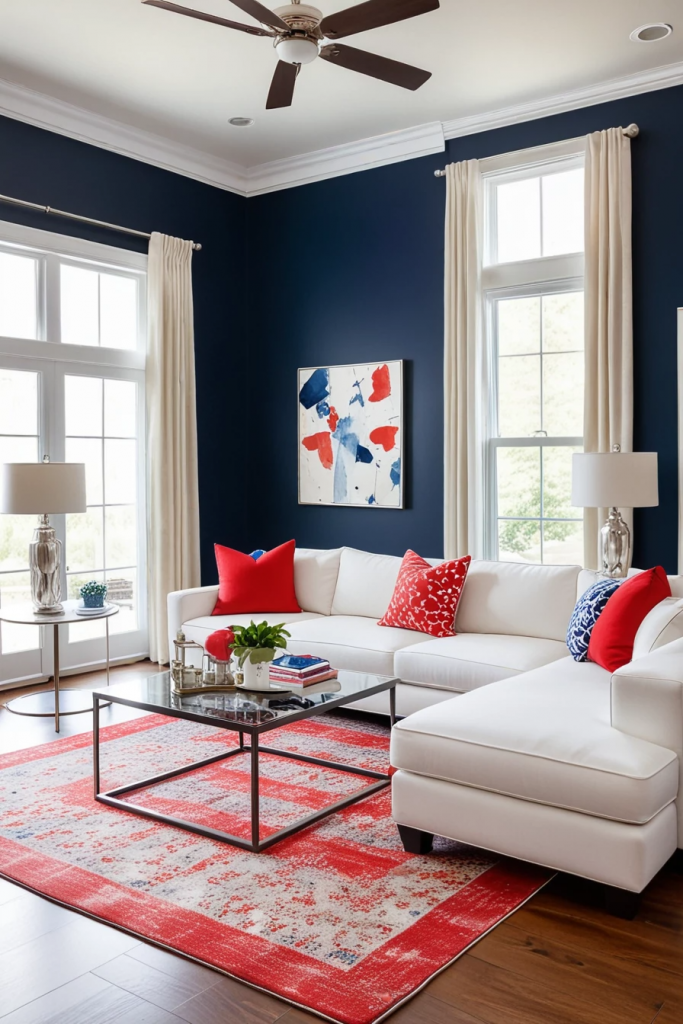The design incorporates a perfectly balanced patriotic color scheme. The space is anchored with navy blue walls, white sectional sofas, and red accent pillows that add richness. Cohesion is added with a large patterned rug featuring star motifs. Silver floor lamps, abstract art, and selected shelf accessories create streamlined decor. The festive nature and harmony of colors feels fresh and classy.