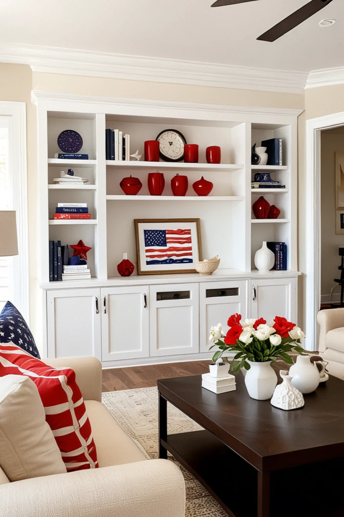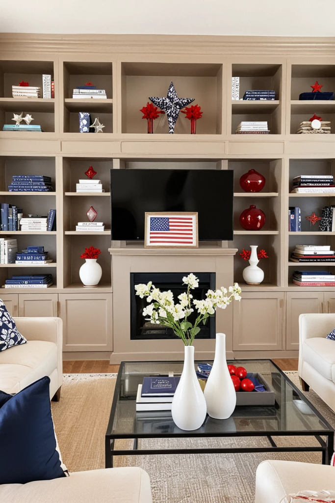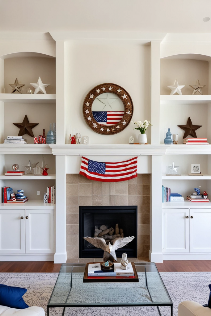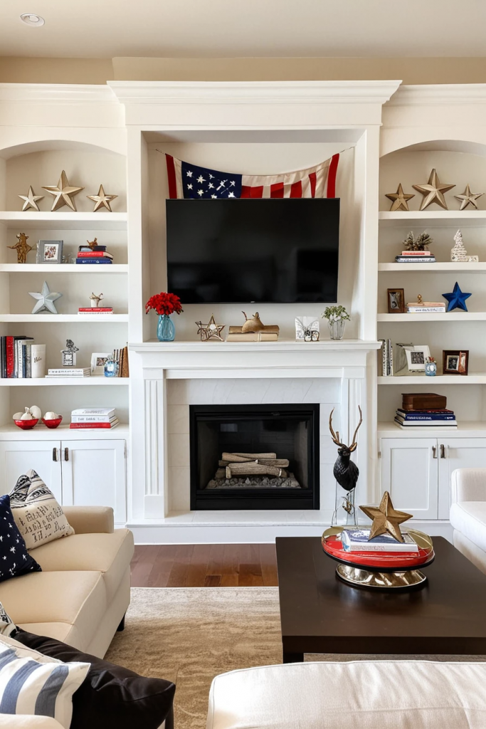 Chic shelving provides the best space to style sophisticated holiday decorations. This living room feature custom built-in shelves which include a modern fireplace. The shelves are filled with a decorative collection which contains books, sculptures, and red, white, and blue decorative items. Miniature eagles and star-shaped glass ornaments are beautifully arranged with vintage American themed books. The shelves evoke the sensation of a designer showcase; balanced, intentional, and artistic.