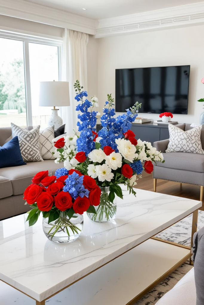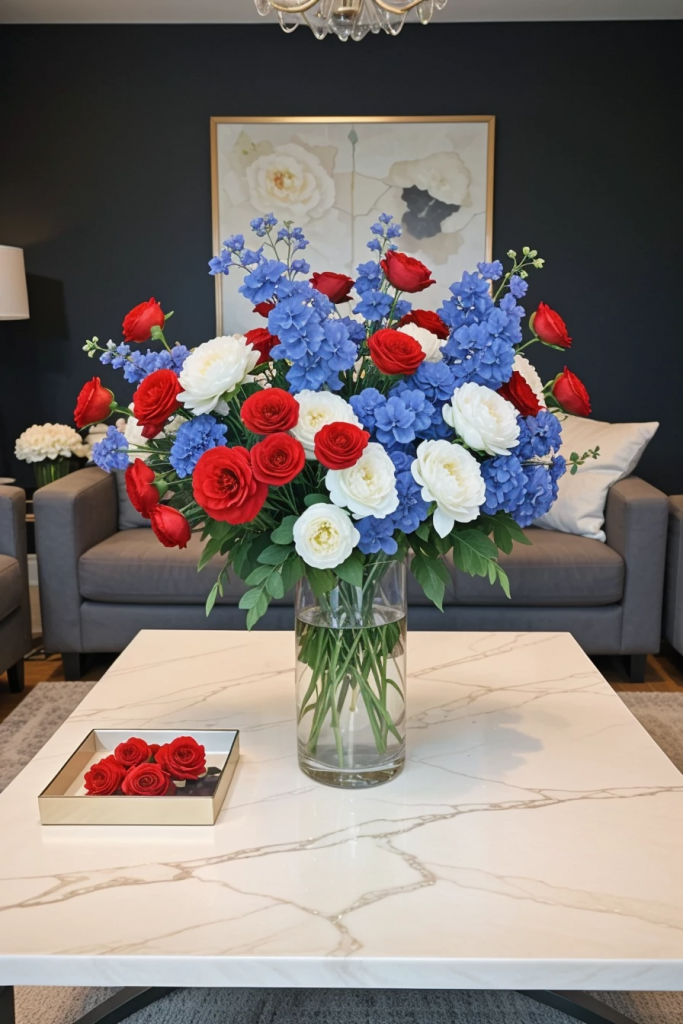 Tasteful Florals in Patriotic Shades for Coffee Table Decor