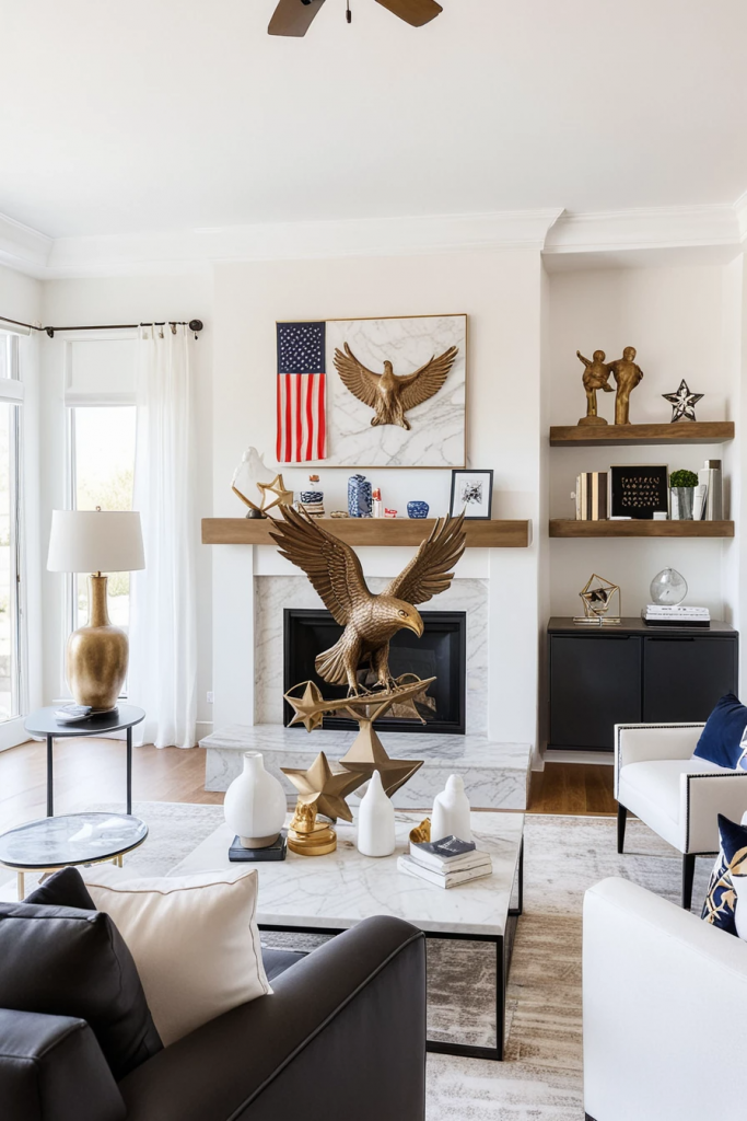 This approach creates a sophisticated holiday atmosphere using sculpture decoration. Eagle bronze sculpted figurines on marble stars and minimalistic patriotic ribbon busts are placed carefully atop floating shelves and glass display case. The living area hosts black and white monochrome armchairs and seat covers, effortlessly highlighting the stunningly subdued decor which serves as nods to American patriotism. All of them work together in unison to maintain an exceptional equilibrium of festivity and art.