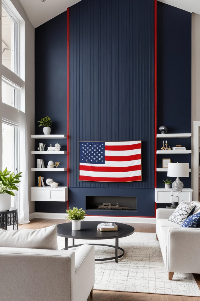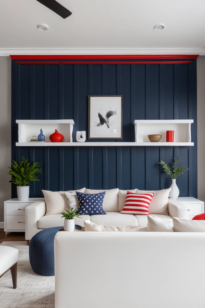 Focusing on the 4th of July theme, this living room has an accent wall that embodies the 4th of July spirit while also keeping the charm of the room intact. One of the walls is painted navy blue and has vertical molding to give it a more 3D appearance. It is decorated with thin red trim, and sleek white shelves. The rest of the walls have a light gray which provides study contrast. The sofa is low profile, and paired with modern minimalist furnishings so that the accent wall stands out the focal point.
