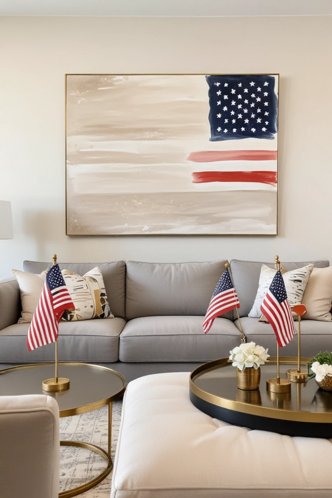 There are many tasteful ways in which the American Flag can be displayed. This area uses a custom framed abstract flag art piece in muted colors of ivory, steel blue, and dark red as the centerpiece above a contemporary gray sofa. Side tables with vintage brass stands show off smaller fabric flags. Contemporary furniture in neutral colors are set in the rest of the room so the flag design features can pop while not being overly dominant in the decor.
