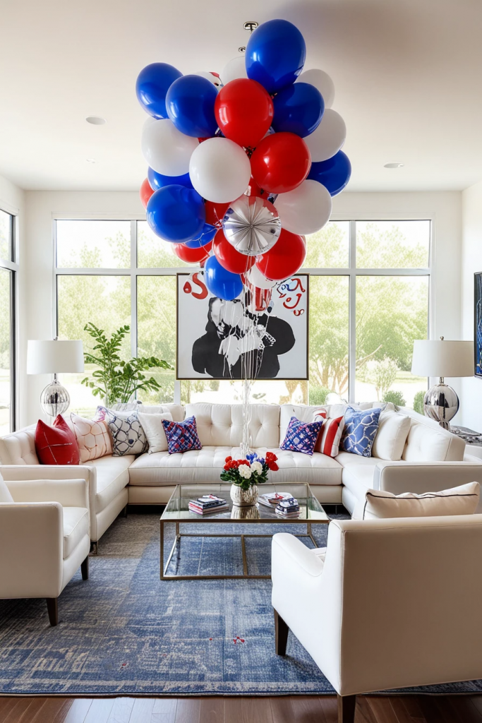 When performed appropriately, balloon decor can be sophisticated. This concept features a curated balloon installation above the seating area—chromed and clear orbs are intermixed with clusters of matte red, white, and blue balloons. The room itself has sleek cream furniture accented with metallic bedside tables. The balloons add vertical interest and celebratory energy without feeling chaotic or juvenile. It is a sophisticated festive display with a bold twist.