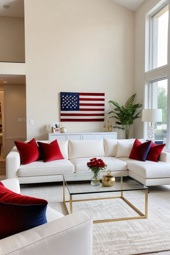 The sophisticated approach captures the essence of the holiday while still retaining a modern feel. This exquisite room has plush white chairs, glass coffee tables, and minimal flag-inspired wall art along with navy and red velvet pillows. Natural light streams in from the sizeable windows, illuminating the space. The room is accented with soft gold and golden neutral hues on the walls, making them a stark backdrop. This design is a fusion of sophistication and patriotism, ideal for those who prefer to celebrate without being over the top.