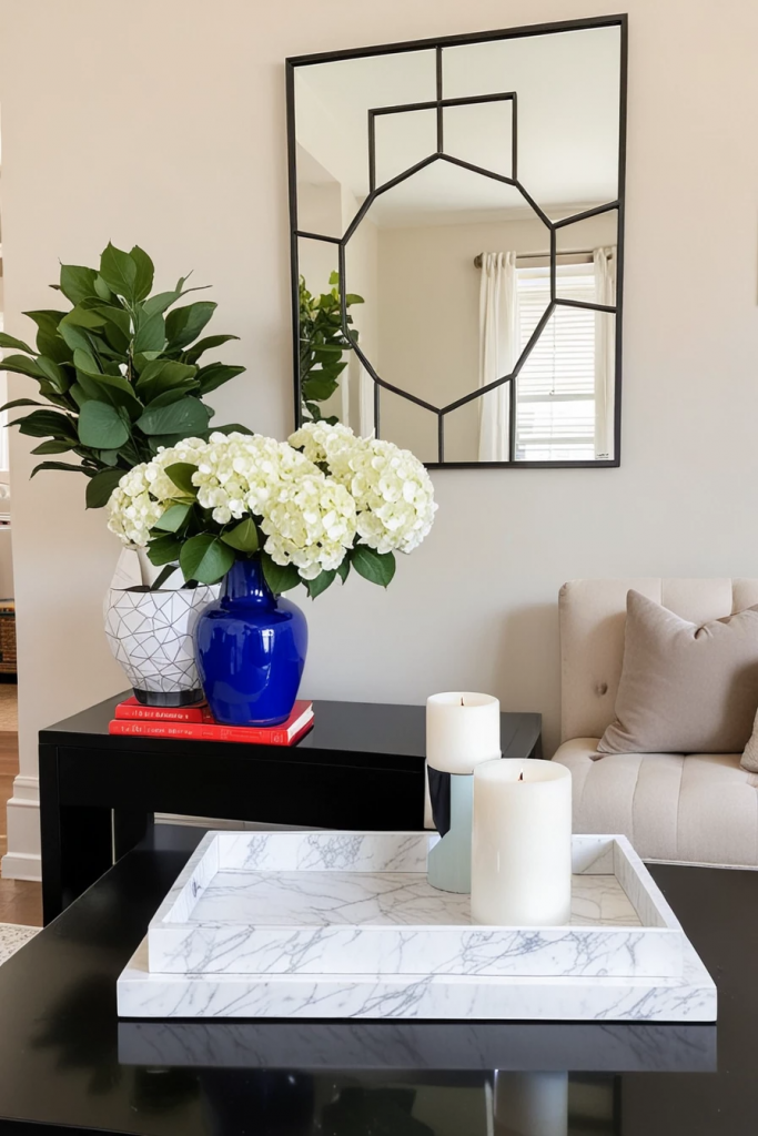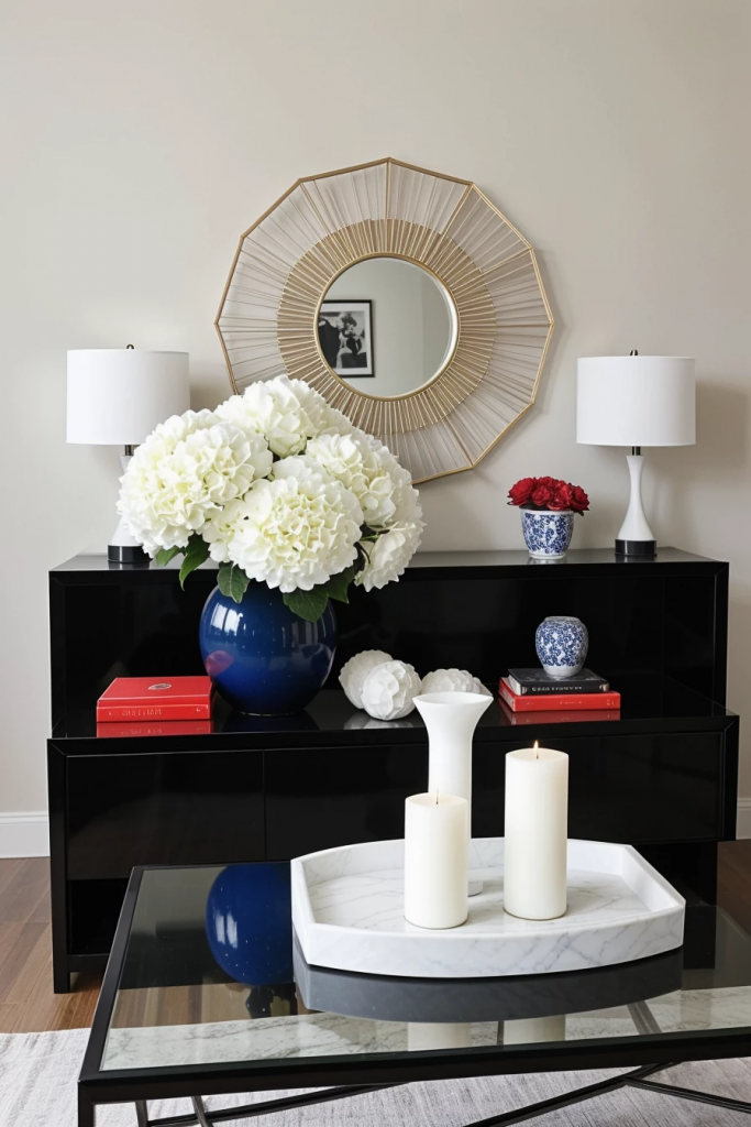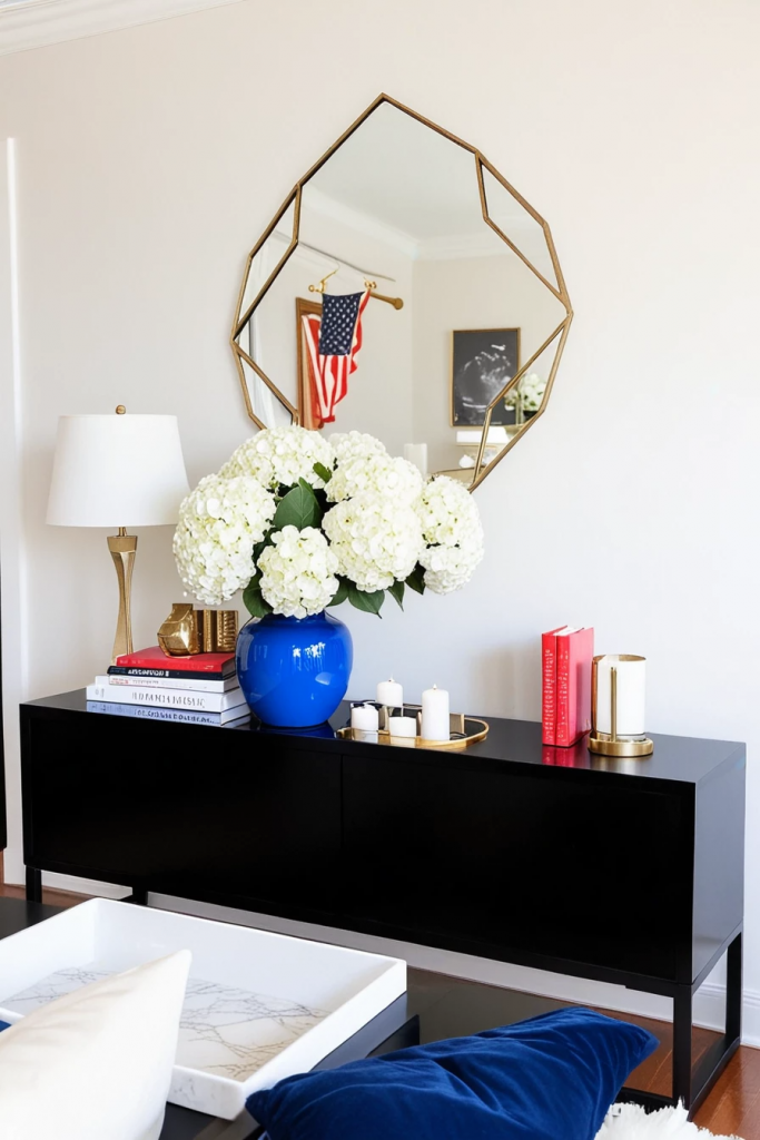 The combination of polish and memories that a sleek console table evokes makes it a perfect addition for playing around with festive colors. In this particular living room, a black lacquered console is adorned with sculptural style blue vases with white hydrangeas, a stack of red coffee table books, and a white marble tray filled with patriotic candles. The table is placed under a modern mirror with geometric edges—serving both as an aesthetic anchor and spatial illusion. It’s effortlessly versatile without clashing or competing with the other pieces of furniture.