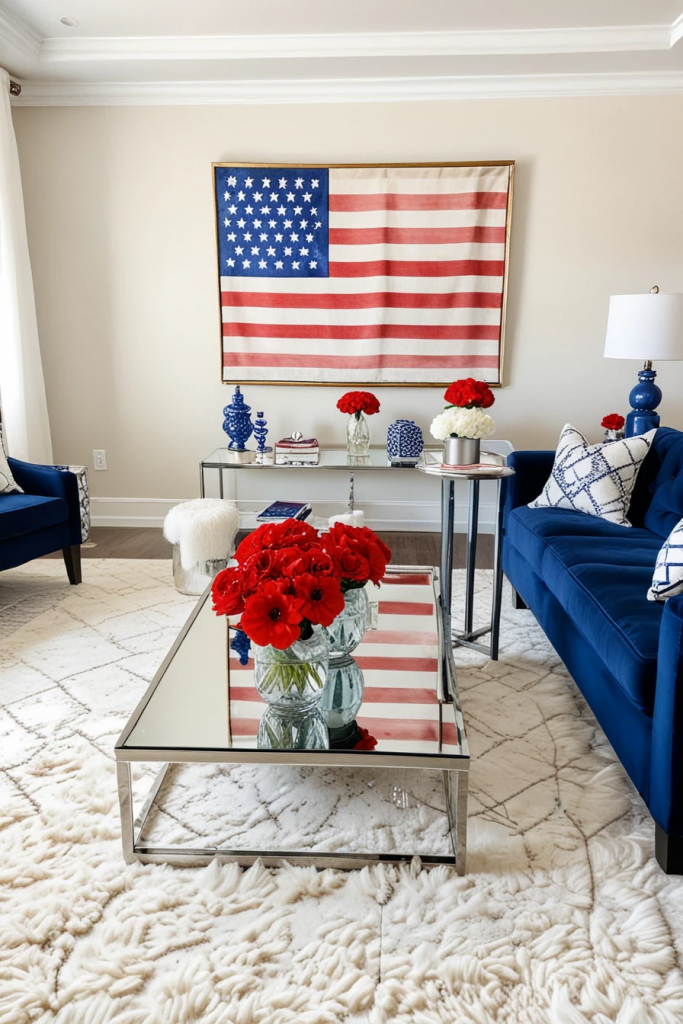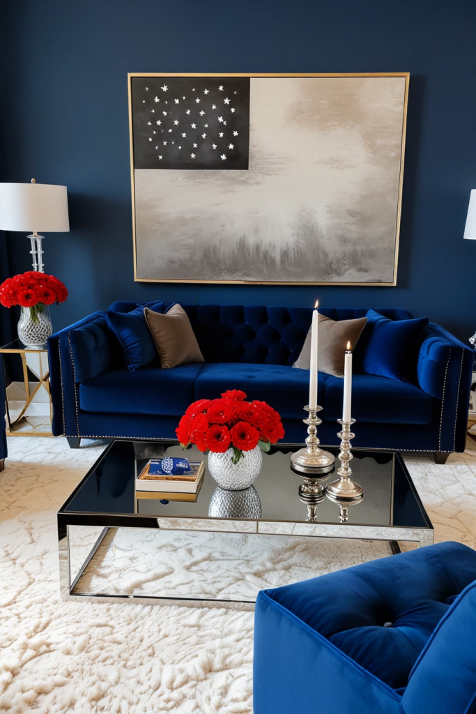 The living room is decorated with rich furnishings with luxurious textiles. A white shag rug and mirrored coffee table complements a navy velvet tufted sofa. Side tables feature red floral arrangements and metallic blue candle holders. A relaxing yet bold patriotic statement comes from an oversized piece of art featuring a muted flag motif.