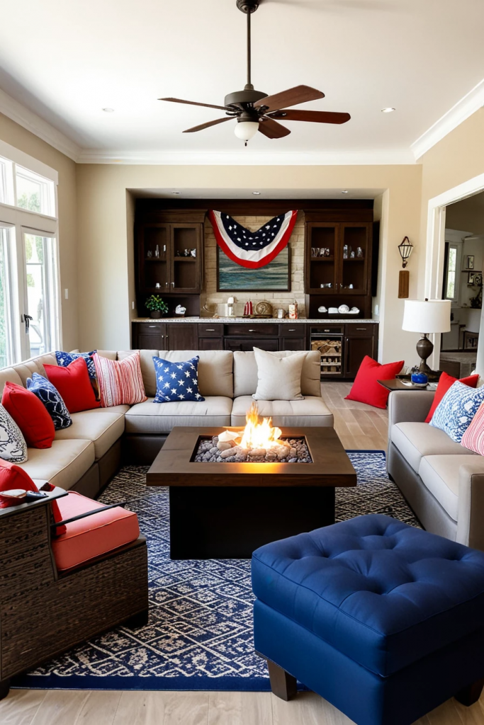 Style and function combine in this living room layout made for entertaining. Conversations are easy to follow and seating is abundant due to the U-shaped sectional that surrounds a fire pit low profile coffee table. An array of vibrant cushions and a navy ottoman serve as gentle pop hints to warmer shades on the palette. A built-in bar cart in the corner is ready for use with themed 4th of July glasses and napkins. Chic and comfortable, this space is flawless for hosting celebrations.
