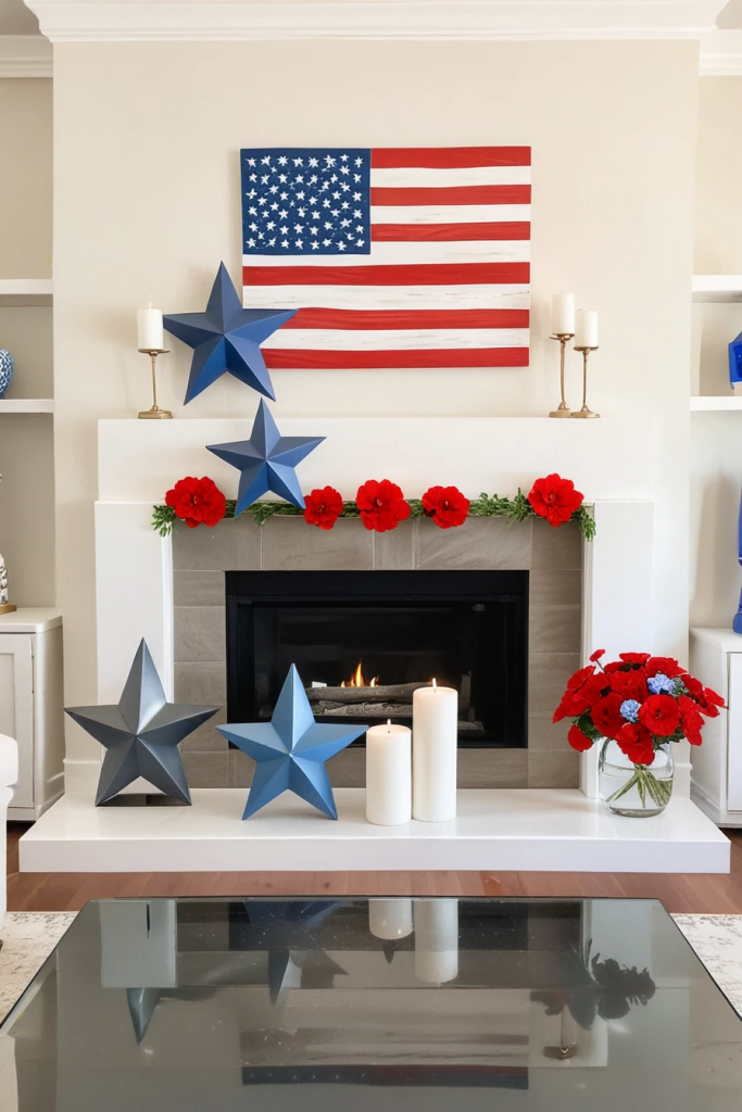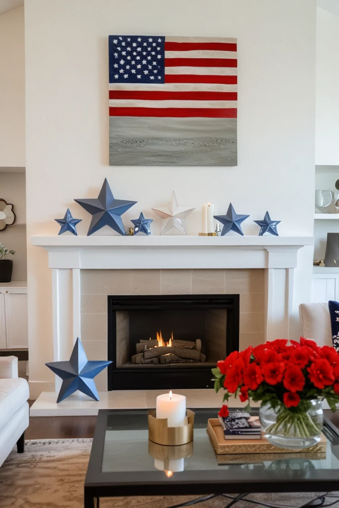 The 4th of July living room decorations can be completed by having a beautifully styled mantel at the front. The setup has white built-ins around the fireplace. There is a set of white candles inside glass holders that emit soothing light and set the mood whilst blue star sculptures along with The United States flag artwork creates life into the theme below the fireplace. Some red flower arrangements do the finale touch to complete the beautiful display. The elegant The United States of America set up that is flassy but festive with modern aesethtics looks wonderful.