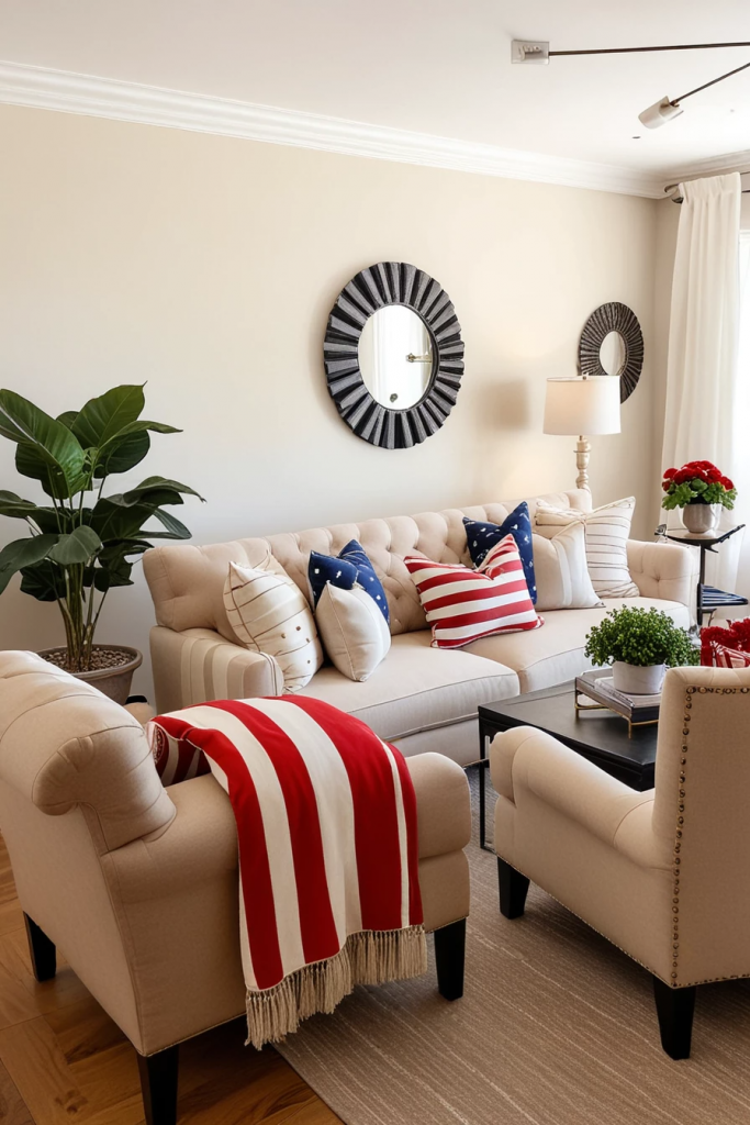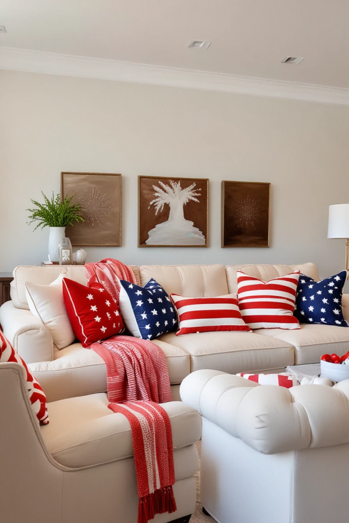 Including designer pillows and luxe throws in stars and stripes patterns instantly adds 4th of July flair to the living room while maintaining elegance. Consider deep navy embroidered cushions with white stars or minimalist throws with red and white stripes draped over a tufted armchair or chaise. These details should be placed on neutral toned furniture to ensure the room is not overpowered while still showing off patriotic details. The right style combines comfort and sophistication with strong patterns.