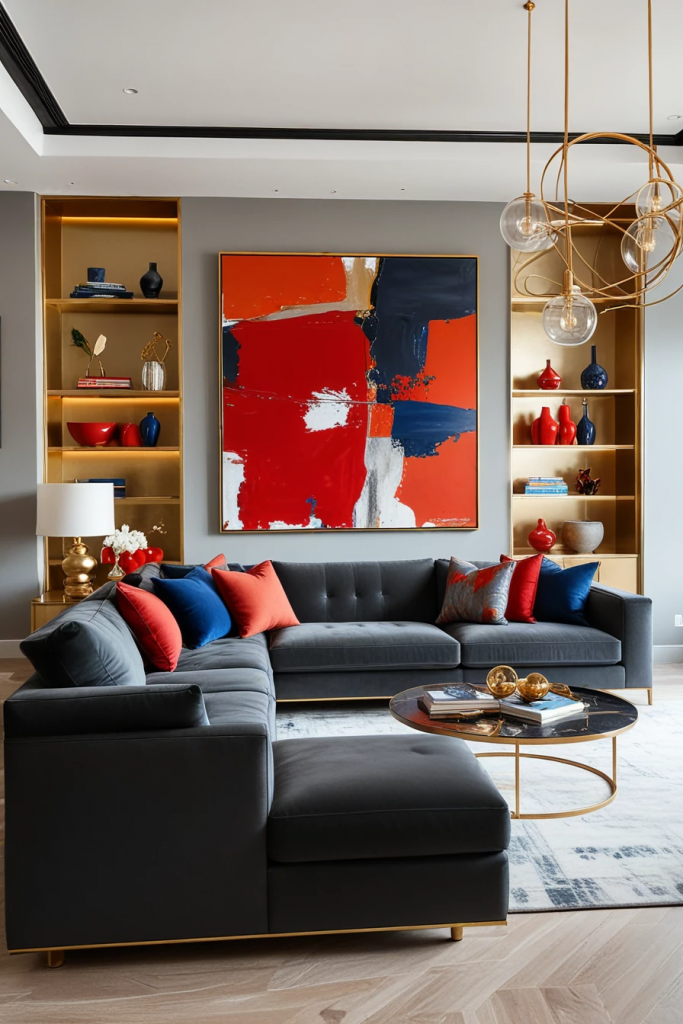 In this luxurious living room, artwork gets full attention. Commanding American-themed abstract paintings are tastefully set into crisp white walls. Accessories in red and blue animate alongside a charcoal gray sectional. Sculptural lighting and gold-trimmed shelves add to the luxurious feel of the room. Such a setup is perfect for those who appreciate design-focused spaces that are meaningful.
