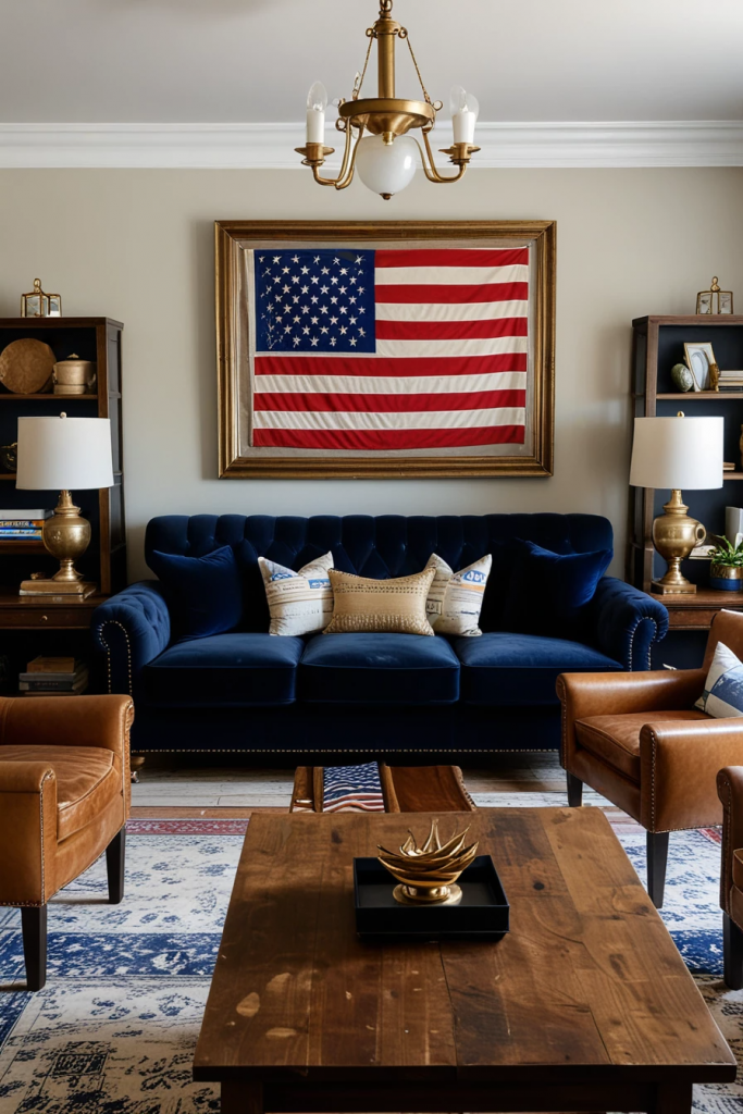 Sophisticated Living Room Decor with Vintage Flag Elements