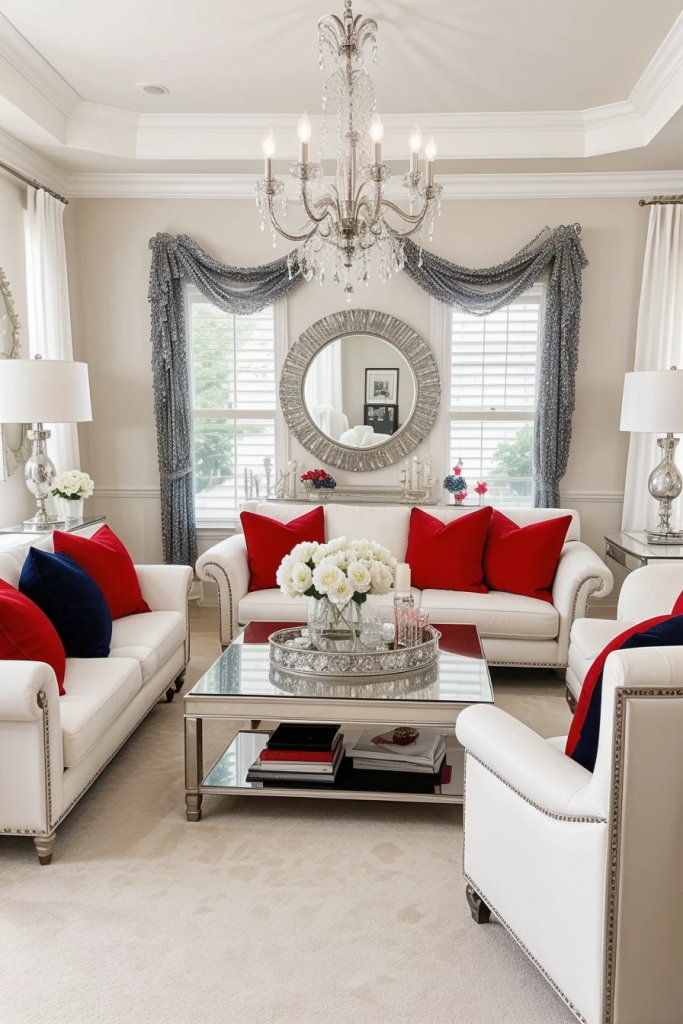 To host an extravagant celebration, this living room is decorated with metallic accents. It features a mirrored media console, a chrome coffee table, and a white sofa trimmed with silver which adds to the elegance of the room. The red and blue silk pillows further enhance this feeling along with the silver star garlands on the curtain rods. These transform the pillows into centerpieces. Everything comes together with a chandelier while turning into a stunning living room.