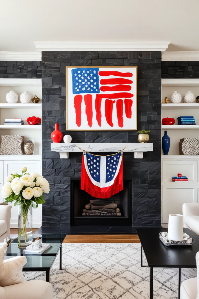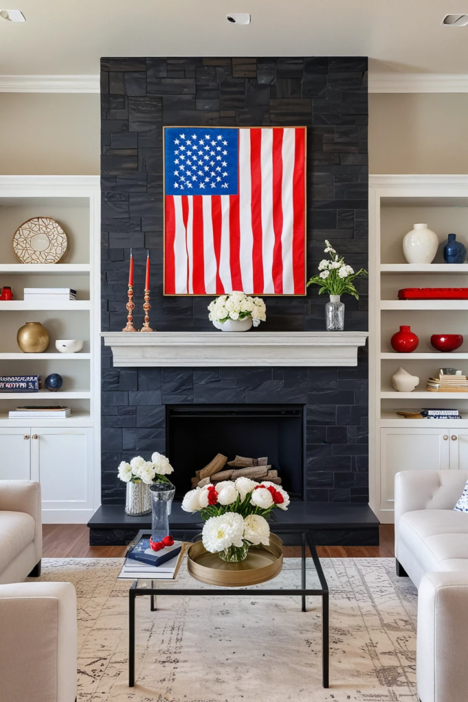 This fireplace setting integrates contemporary refinement and Fourth of July splendor. The modern bold fireplace wall featuring black stone is bordered by open shelves decorated with hints of red, blue, and white. Above the mantle, there is an eye-catching depiction of the American flag which adds exceptional charm. On the flanks of the hearth stand tall ceramic vases filled with red and white peonies. Everything unified and sophisticated feels cohesive and elegant, ideal for homeowners aspiring for a stylish yet patriotic glowing fireplace.