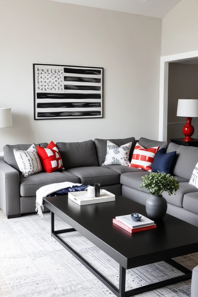 A monochrome approach goes above and beyond the 4th of July style. The space is decorated in a gradient of gray from charcoal to pearl, peppered with blue and red tones. A sporty gray sectional sofa is situated under an enormous gray and red flag vertical contemporary oil painting. Place accent pillows in navy and red, and the dull color scheme breaks. The room is anchored with sleek textured matte black elements, proving you can stylishly celebrate the country with subdued hues that aren’t flashy.