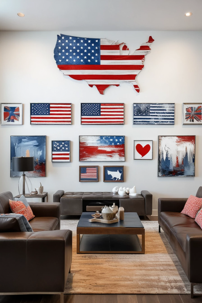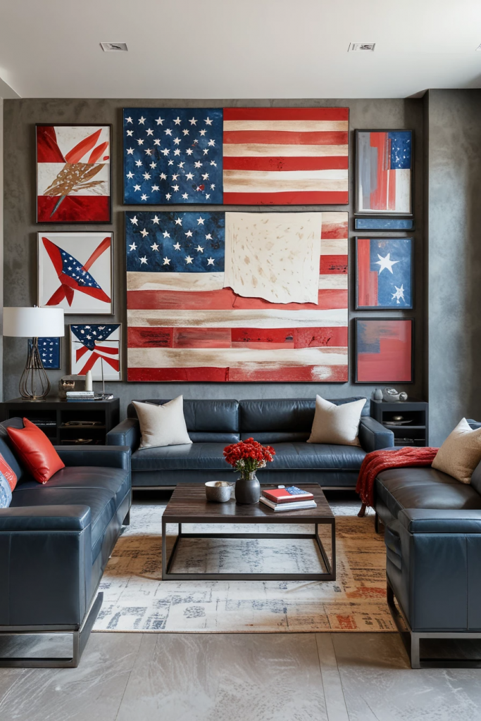 In the refined design, the walls showcase American-inspired artwork and textures. The American-themed gallery wall of mixed media pieces—abstract star compositions, subtle flag remnants, and text overlays from relevant history books—anchors the space. The subdued, contemporary hues of gray, blue, and soft red work in unison to achieve a balanced muted color palette. With leather seating, brushed metals, and modern color schemes, this room feels like a curated tribute to the country’s spirit.