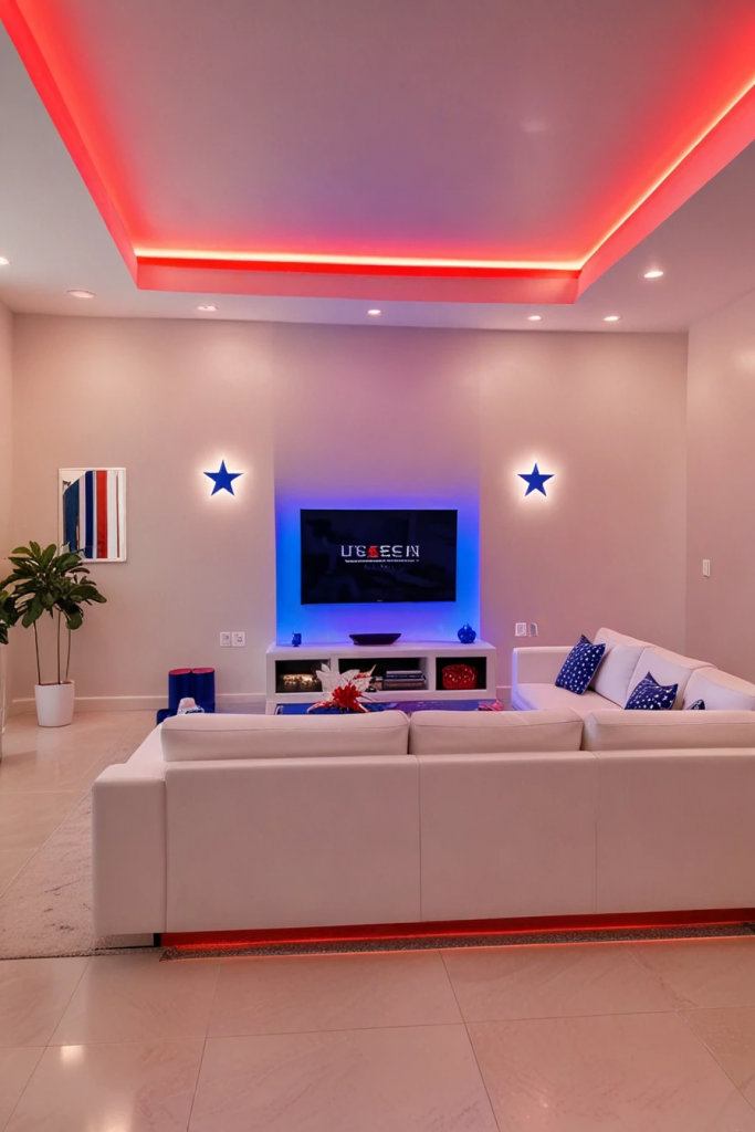 The lighting for the 4th of July can be easily achieved with the use of LED lights which gives a celebratory feel to the room. An example of this design is having the ceiling lights set to red, white, and blue LED colors and Eagle themed sconces on the star media center. The media unit can also have LED strip lights mounted on the promo, trim, and fame. The underlying tiles as well as the leather sectional can be polished so that they reflect the light which would make the room exude elegance. There remains a balance to the festive energy supplied in the room.