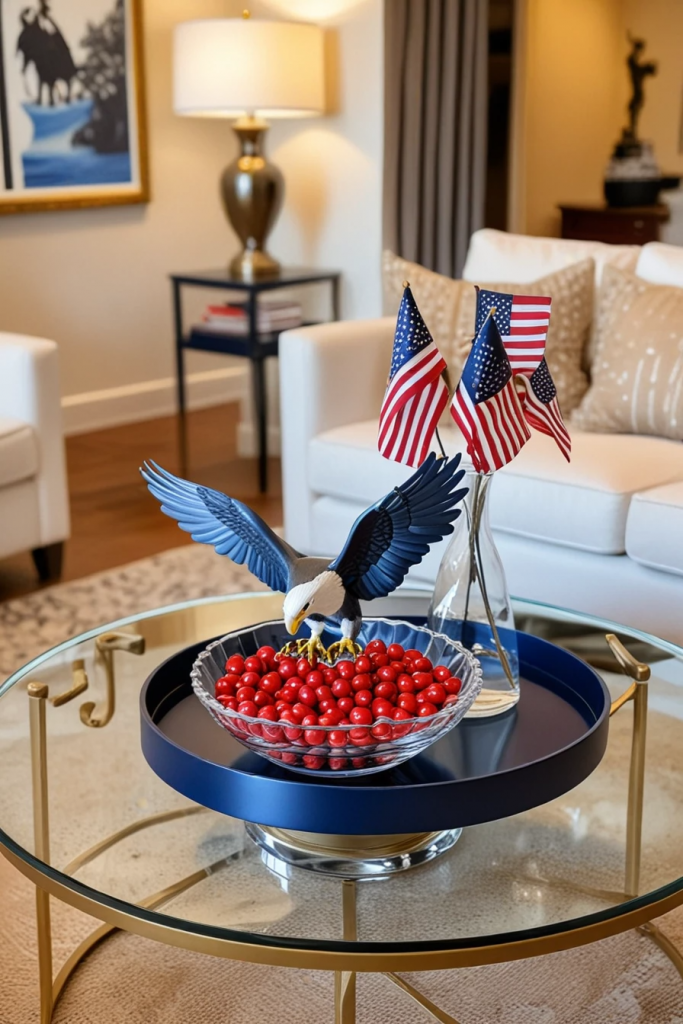 The coffee table is a wonderful place to display stylish patriotic decorations. For this design, a round glass coffee table is topped by a navy tray with a small crystal bowl of red berries, a white porcelain eagle, and a vase full of small American flags. Clear modern lines and plush textures characterize the surrounding furniture. This centerpiece feels balanced and refined, celebrating hte purpose of the room while also drawing the eyes of its occupants.