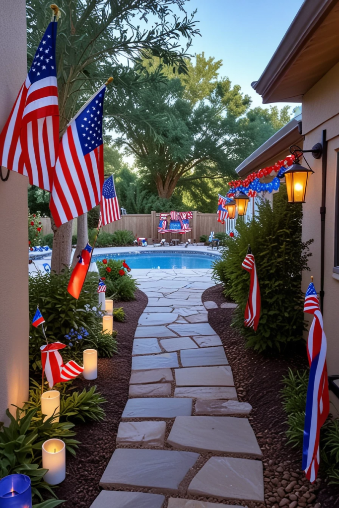 Assist guests in navigating their way to the pool by providing them with festively decorated walkways. Use tiny American flags, lantern bags, or pole sashes to mark the route. Place potted plant positions containing warm red and bold white flowers tendrils for a gentle yet patriotic phytocelebratory accent. These elements, and many more, really go a long way in improving the aesthetic of the space.