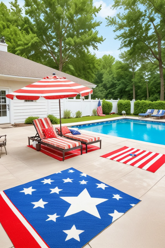 You can change the blanket look of your pool deck with outdoor rugs and turn them into pieces of beauty for your guests to enjoy. During the 4th of July you can use stars and stripes themed rugs so your guests can step on them or chill on them. You can put the rugs right by the pool, under lounge chairs, in the dinning area, and at the entrance of the pool. These rugs can also mark different areas of the pool, so guestshowed from the hot concrete tannade these rugs to increas their style.