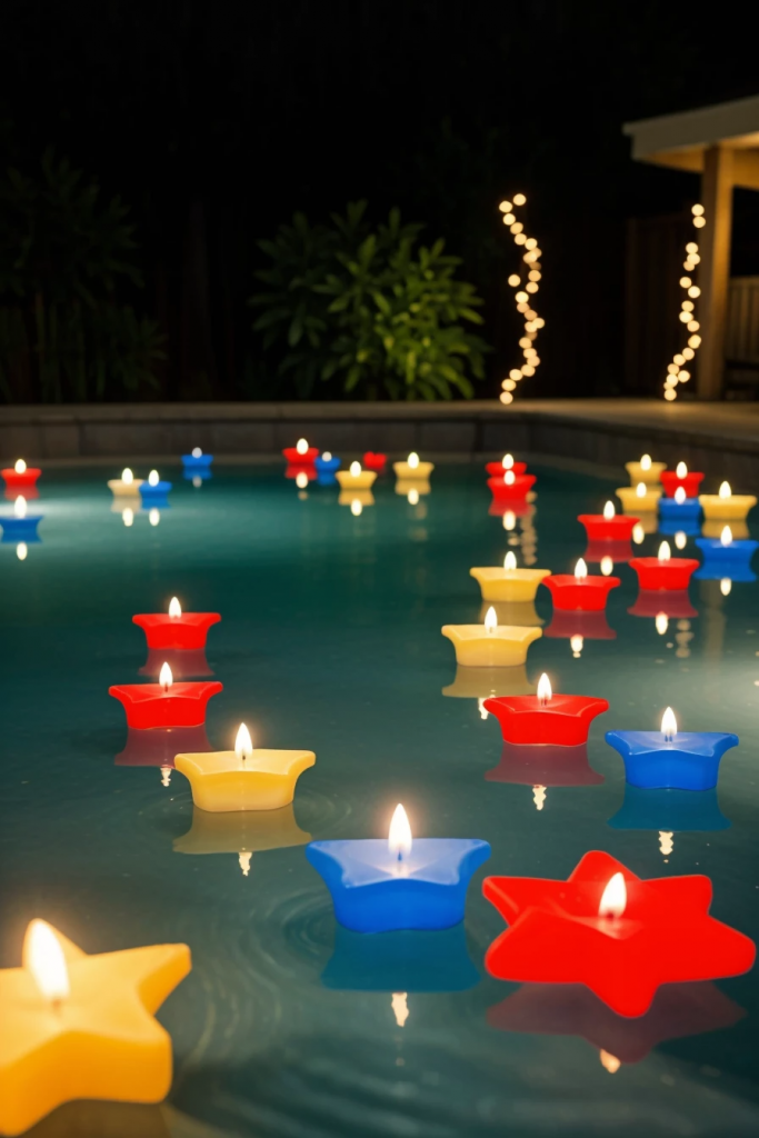 Floating candles in the shape of stars set the mood for a nighttime swim. These waterproof candles give off a soft glow that beautifully reflects off the water’s surface. Keep with the theme by choosing red, white, and blue candles, and arrange them loosely for a starry look. The candles add a calm atmosphere, making them ideal for night swims–light without the glare.