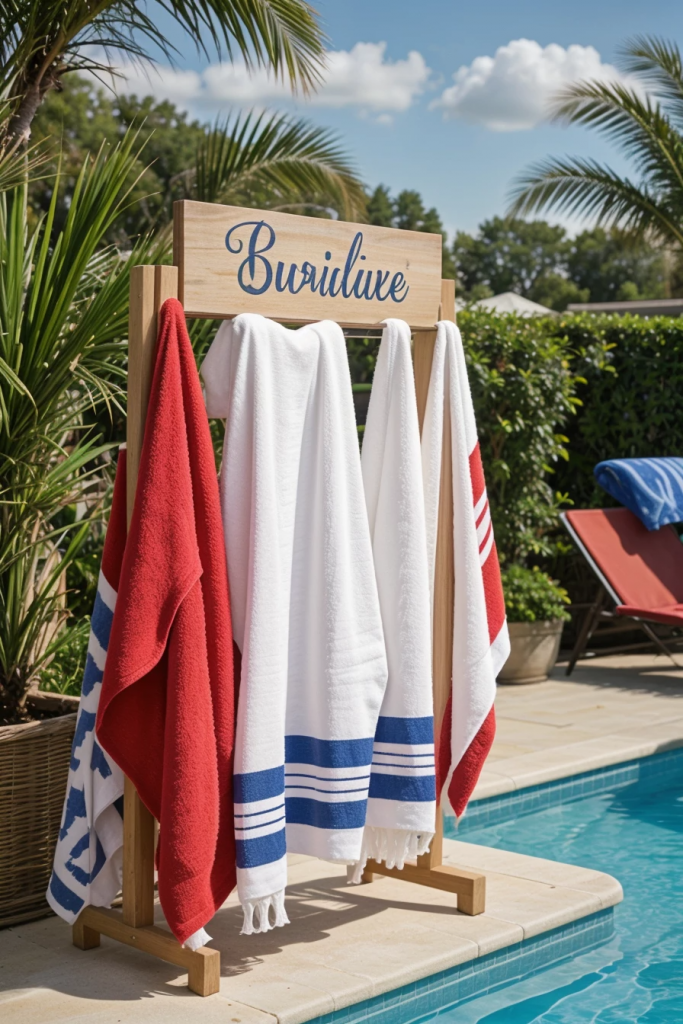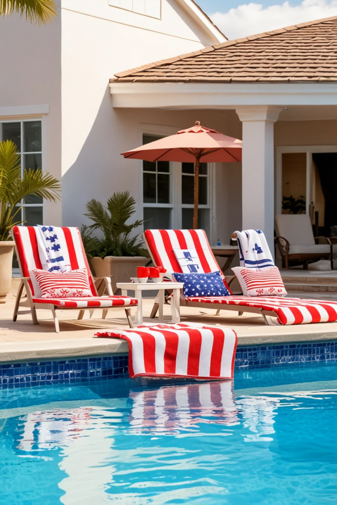 Consider towels as part of your home decour. Towels can, undoubtedly, add aesthetic value. Place red, white, and blue rolled towels on each chair, or display them on rack beside the pool for a better view. Also, feel free to use flag-stripped lounge chairs or bold flag ones to add flair to the area.