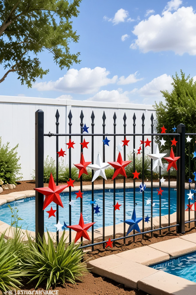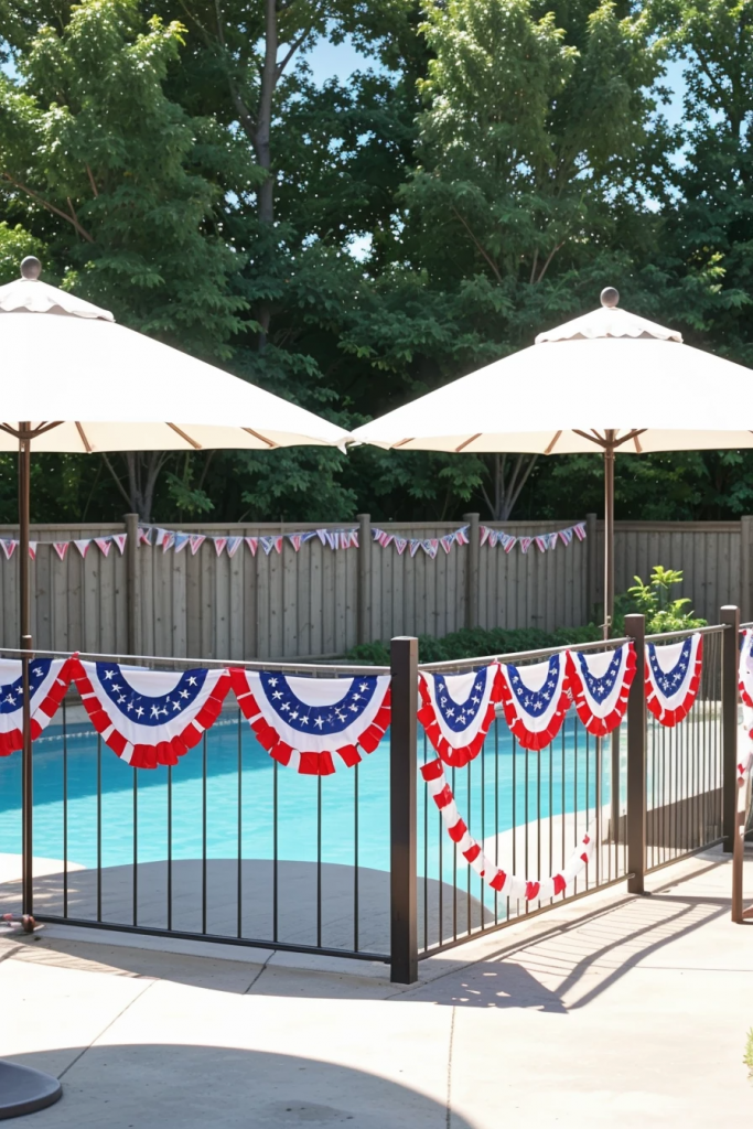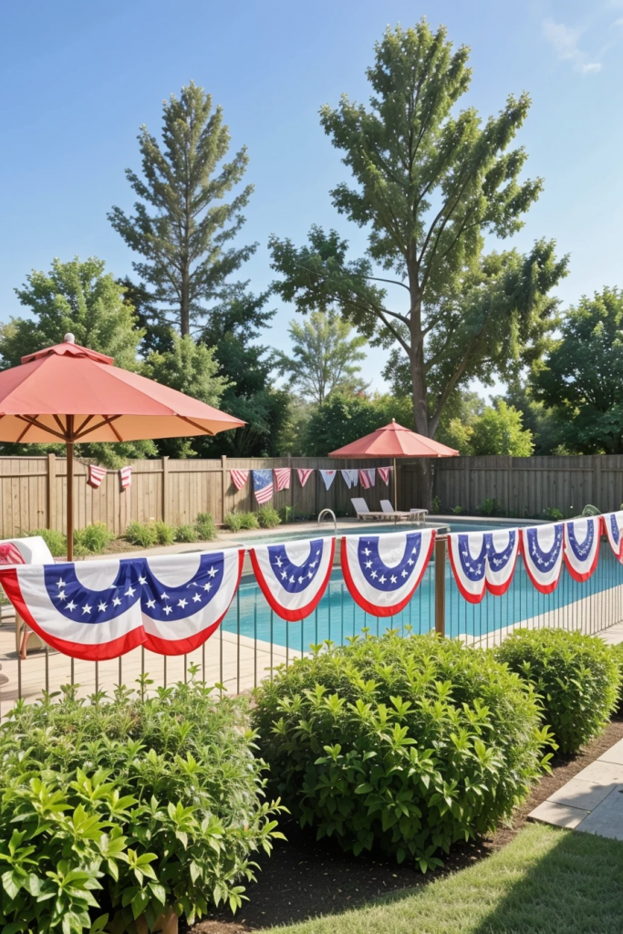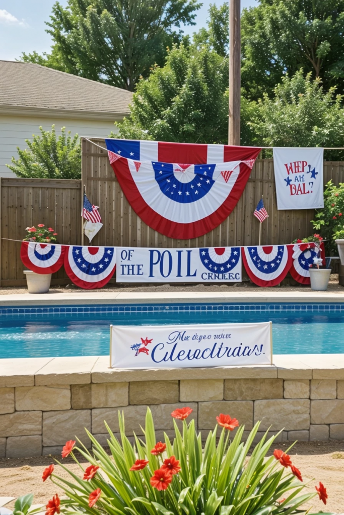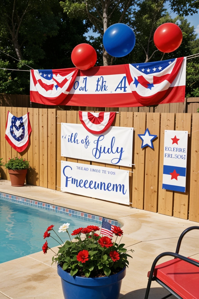 Your pool fencing serves as an ideal backdrop for hanging Fourth of July decorations. Use large fabric banners, wooden cutouts painted in flag colors, or paper pennants. You are able to spell out, “Celebrate Freedom,” “Stars & Stripes” or go for classic flag iconography. Combining different banner types gives your decor a crafted look and depth.