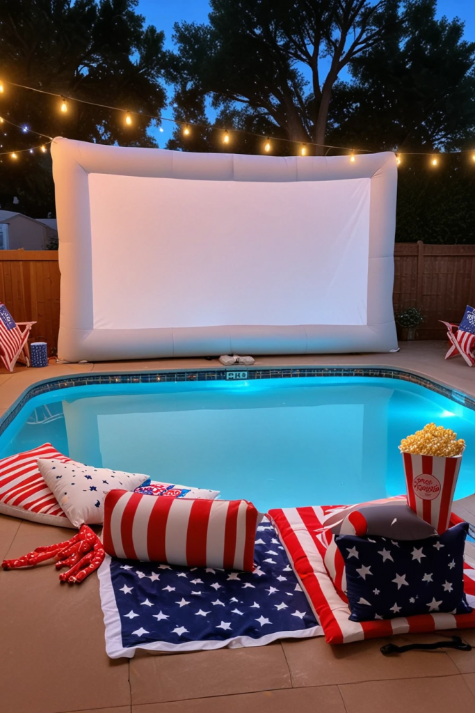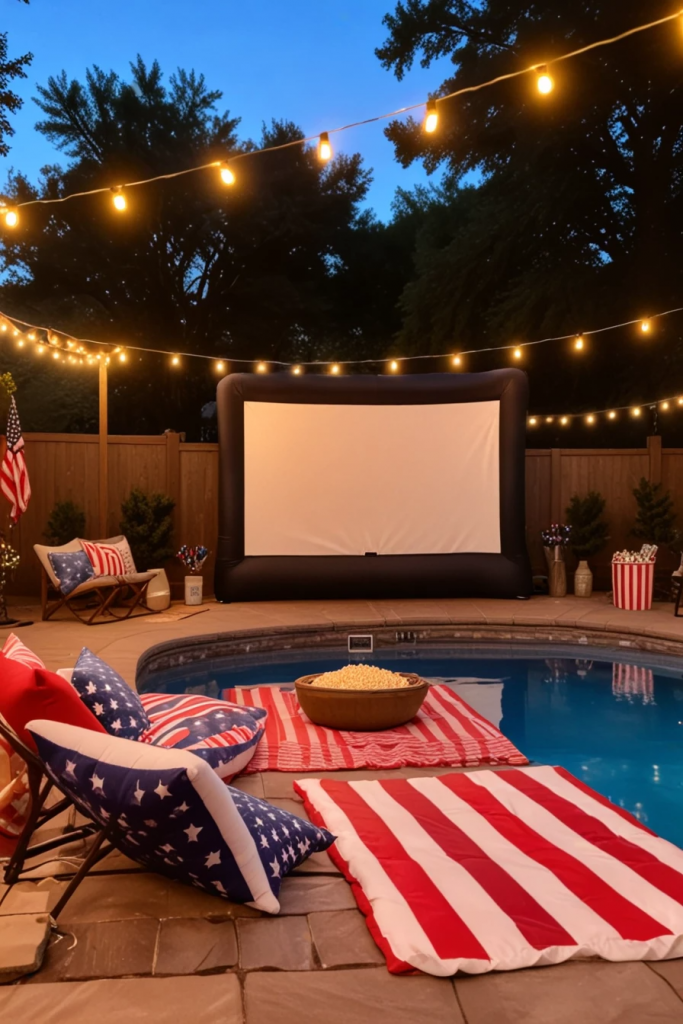 Relax after a fun 4th of July with a cozy pool movie night. You can create a beautiful atmosphere by using an inflatable screen for projection, and hanging a sheet from pool chairs for viewing. Add string lights, a magic touch to bean bags and blankets, and patriotic decorations. Create a festive snack barastic pop caps by placing flag bunting, and fill red and blue bags with popcorn.