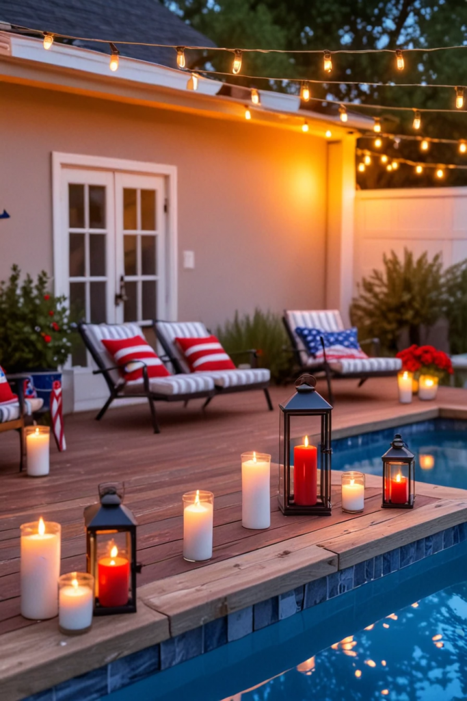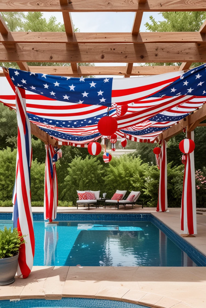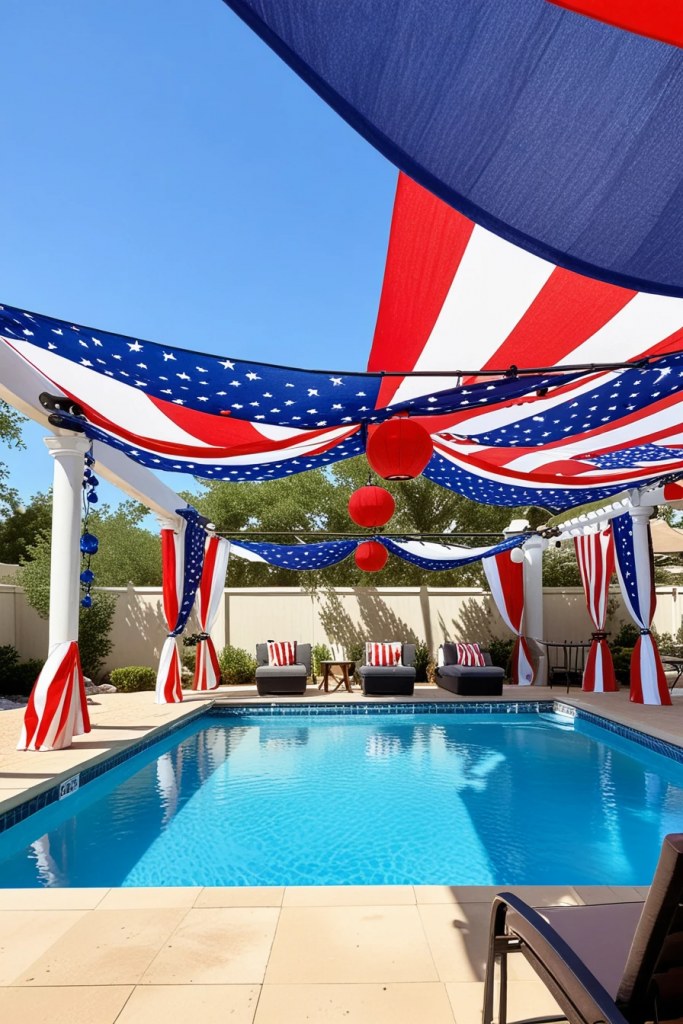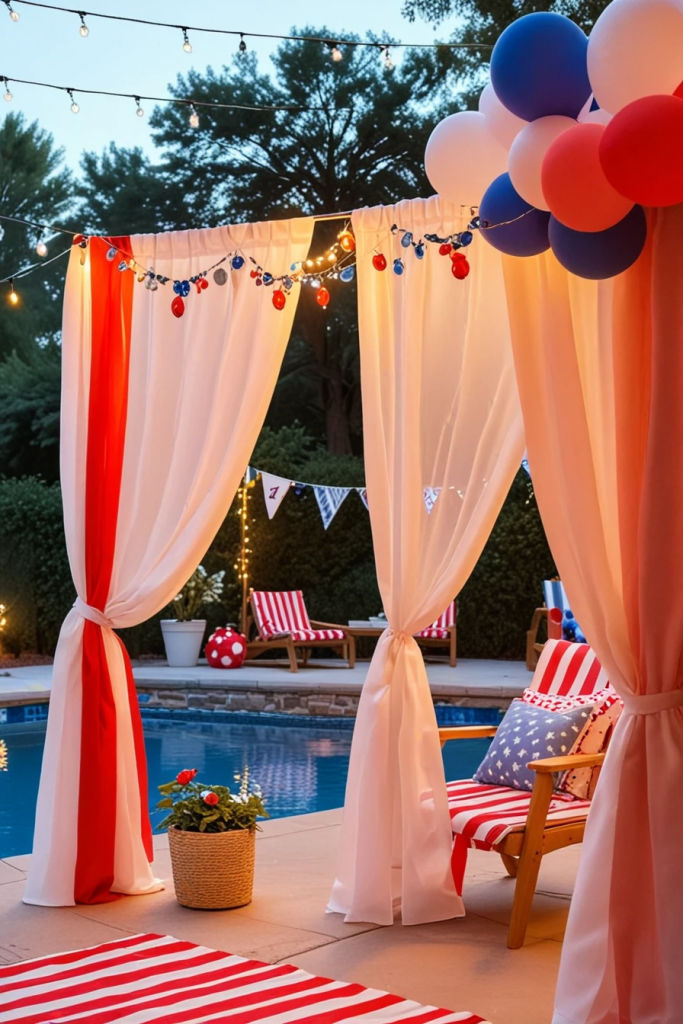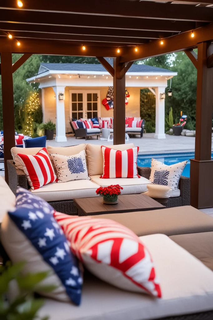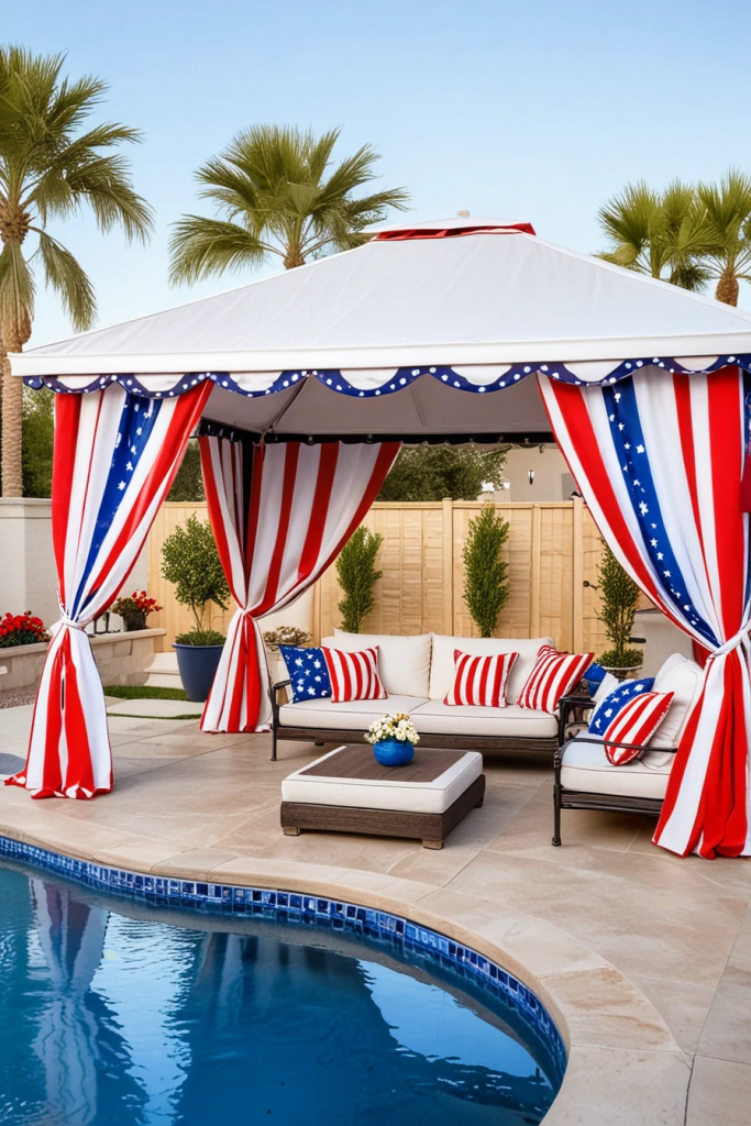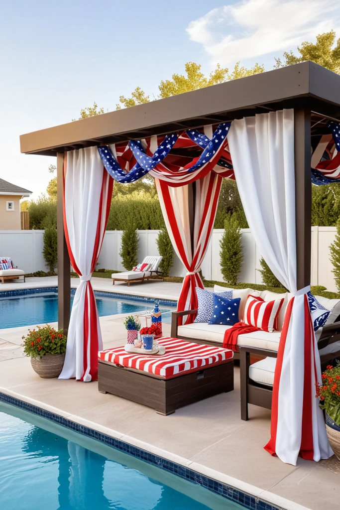For those of us fortunate enough to have a pool cabana, use it as a centerpiece for patriotic elegance. Drape the structure with sheer white fabric tied back with red and navy ribbons. Add plenty of cushions, outdoor rugs, and throw blankets with flag designs. Also add some star garlands by the entrance or a small side table for drinks and snacks. It provides the perfect shaded escape while maintaining style.