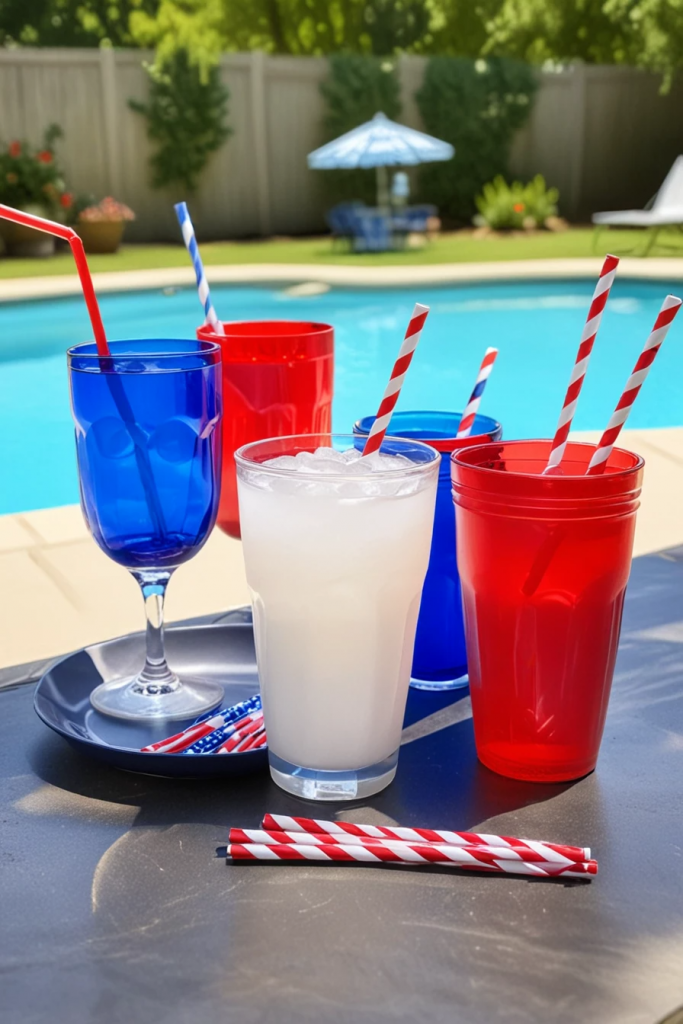 Tiny details matter, and upgrading to patriotic drinkware is simple. Swap out red solo cups for themed straws mason jars wrapped in flag ribbons, and flag star-emblossomed tumblers, or use flag star-emblossomed tumblers with flag mason jars. Pair these with napkins, cocktail stirrers, and coolers of the same colors for a festive and cohesive poolside bar.