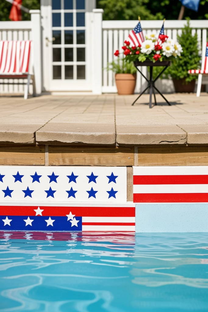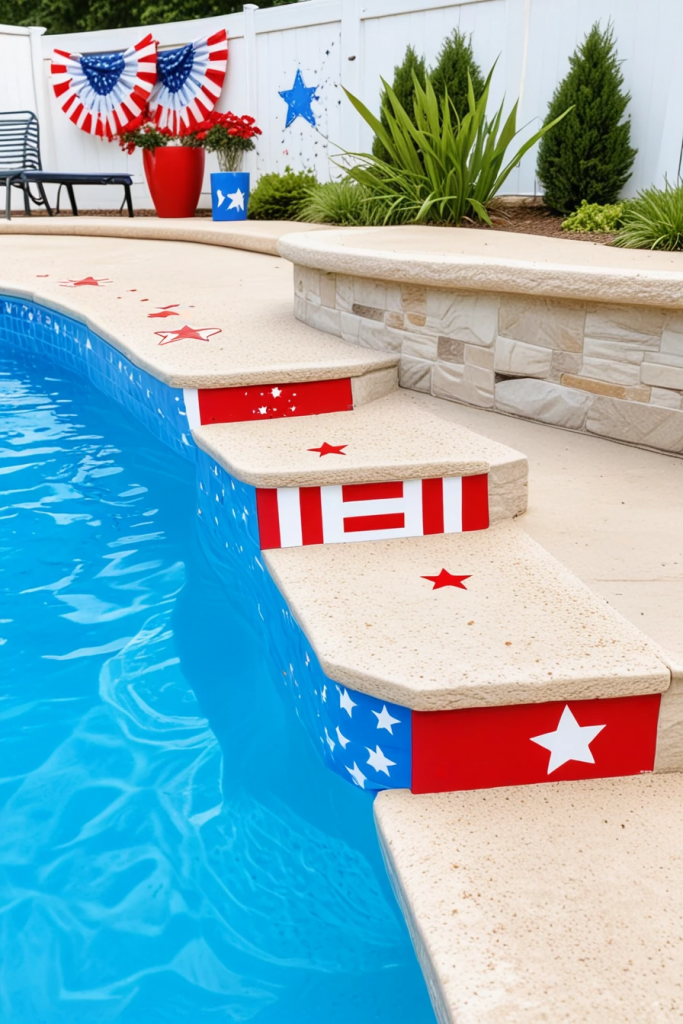 You can spruce up your pool steps with vinyl decals that can be placed underwater. Festive designs like flags and patriotic stars will add pizzazz and excitement to every dip into the water. They cannot be removed and bring a thematic aesthetic to often ignored spaces.