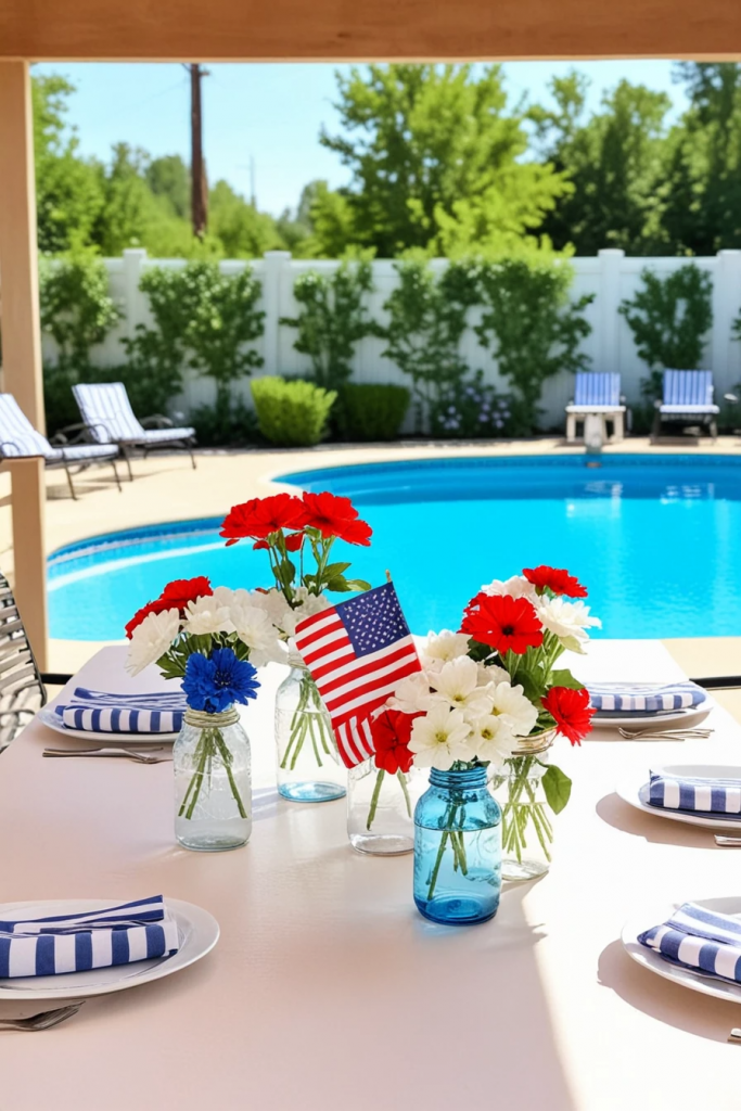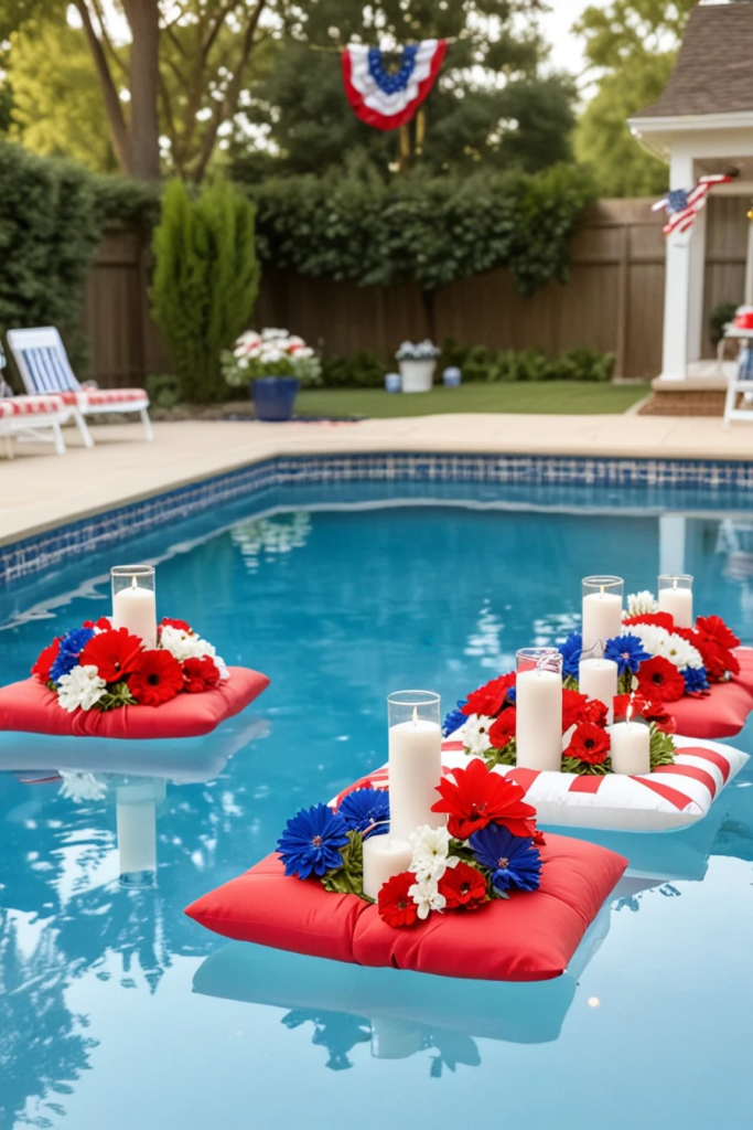 Don’t restrict centerpieces to just the table—try them in the pool too! You can use floral designs in red, white, and blue for floating arrangements. Themed trays with LED lights that are waterproof or mini rafts with candles encased in waterproof holders are also great additions. Your pool decor will be enhanced, making the water’s surface uniquely beautiful.