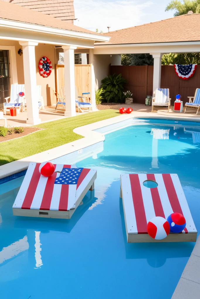 Spruce up your celebration with colorful themed decorations and games – Pool Games that can be decor to get guests immersed in the celebration. It can include cornhole sets and beach balls with an American flag stenciled on it and star patterns, respectively. Themed water guns and foam toys can also add to the celebration with simple creativity. This will leave your guests entertained while keeping your decor consistent during the event.