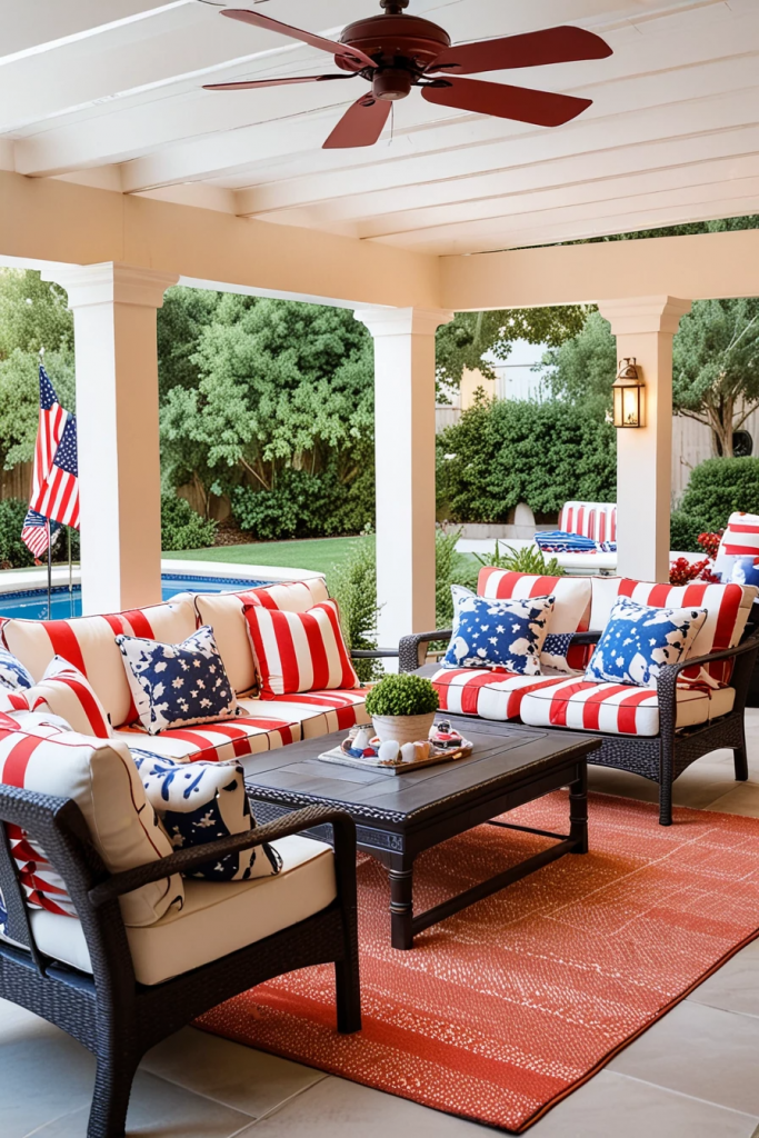 Bring style and patriotism to your poolside seating with Fourth of July cushions and complementary pillows. Use solid red and navy blue cushions alongside star, flag, fireworks-patterned pillows. To enhance both comfort and sophistication, use robust UV fade-resistant outdoor fabrics and arrange them on benches, sofas, and chairs.