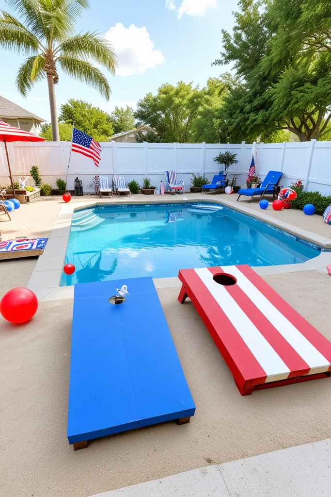 Spruce up your celebration with colorful themed decorations and games – Pool Games that can be decor to get guests immersed in the celebration. It can include cornhole sets and beach balls with an American flag stenciled on it and star patterns, respectively. Themed water guns and foam toys can also add to the celebration with simple creativity. This will leave your guests entertained while keeping your decor consistent during the event.