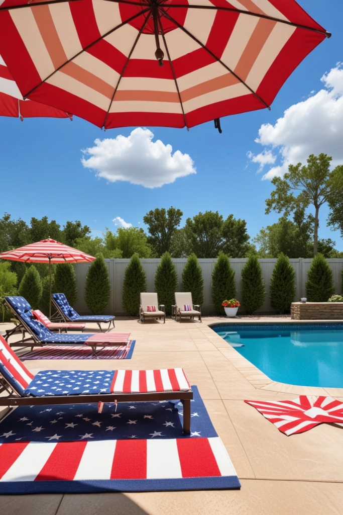 Consider towels as part of your home decour. Towels can, undoubtedly, add aesthetic value. Place red, white, and blue rolled towels on each chair, or display them on rack beside the pool for a better view. Also, feel free to use flag-stripped lounge chairs or bold flag ones to add flair to the area.