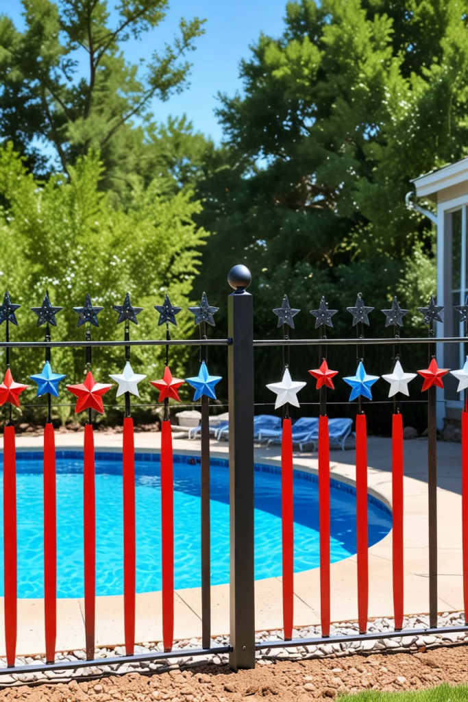 Your pool fencing serves as an ideal backdrop for hanging Fourth of July decorations. Use large fabric banners, wooden cutouts painted in flag colors, or paper pennants. You are able to spell out, “Celebrate Freedom,” “Stars & Stripes” or go for classic flag iconography. Combining different banner types gives your decor a crafted look and depth.