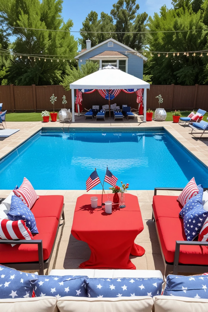 For those of us fortunate enough to have a pool cabana, use it as a centerpiece for patriotic elegance. Drape the structure with sheer white fabric tied back with red and navy ribbons. Add plenty of cushions, outdoor rugs, and throw blankets with flag designs. Also add some star garlands by the entrance or a small side table for drinks and snacks. It provides the perfect shaded escape while maintaining style.