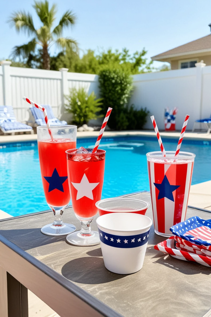 Tiny details matter, and upgrading to patriotic drinkware is simple. Swap out red solo cups for themed straws mason jars wrapped in flag ribbons, and flag star-emblossomed tumblers, or use flag star-emblossomed tumblers with flag mason jars. Pair these with napkins, cocktail stirrers, and coolers of the same colors for a festive and cohesive poolside bar.