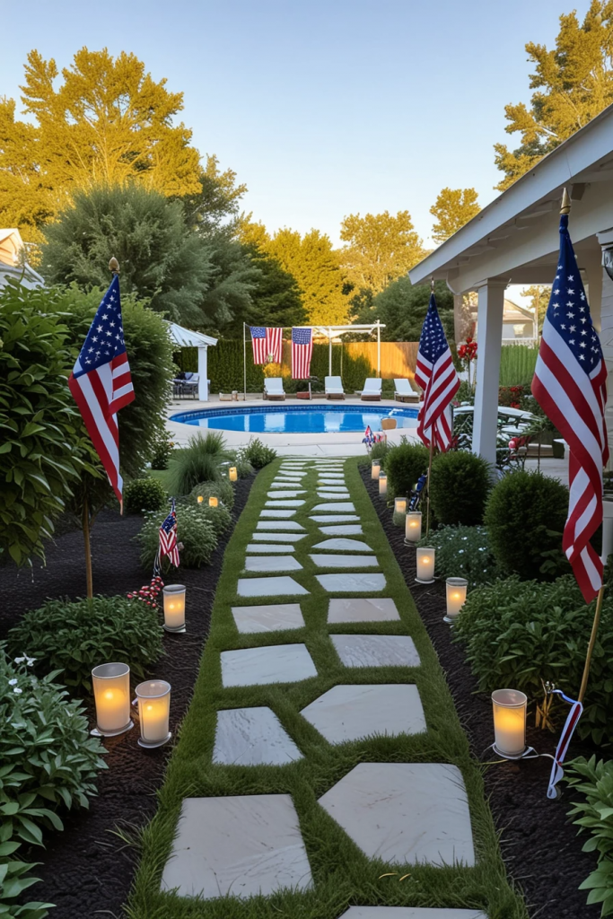 Assist guests in navigating their way to the pool by providing them with festively decorated walkways. Use tiny American flags, lantern bags, or pole sashes to mark the route. Place potted plant positions containing warm red and bold white flowers tendrils for a gentle yet patriotic phytocelebratory accent. These elements, and many more, really go a long way in improving the aesthetic of the space.