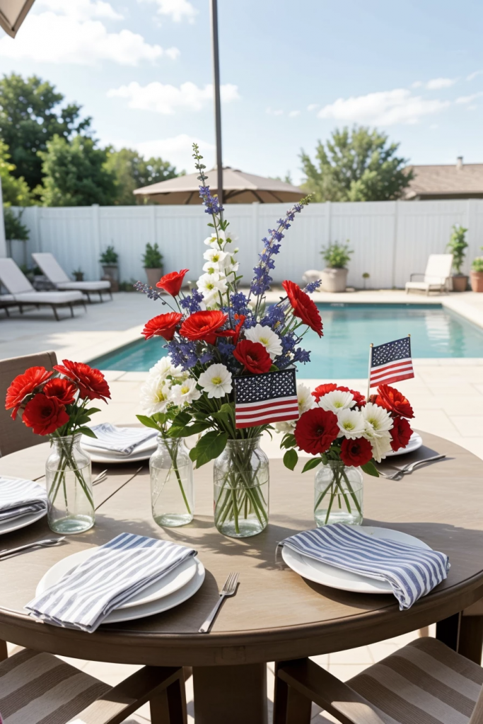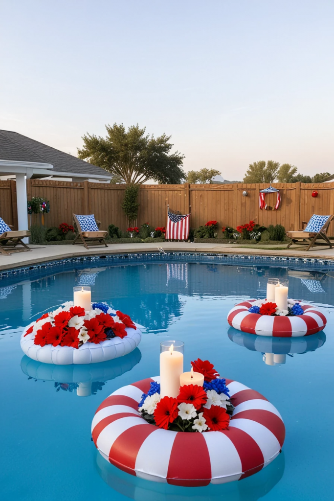 Don’t restrict centerpieces to just the table—try them in the pool too! You can use floral designs in red, white, and blue for floating arrangements. Themed trays with LED lights that are waterproof or mini rafts with candles encased in waterproof holders are also great additions. Your pool decor will be enhanced, making the water’s surface uniquely beautiful.